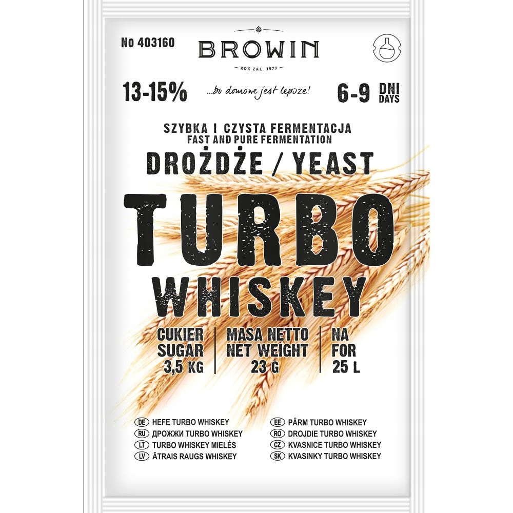 Дистиляторні дріжджі Turbo Whisky - це спеціально складена суміш дріжджів, поживних речовин і вітамінів, ідеальна для швидкого бродіння зернових сумішей (ячмінь, жито, пшениця, кукурудза, рис). Для цих дріжджів характерна стійкість до високих температур. Вони дозволяють протягом 6-9 днів отримати напій з характерним смаком віскі та міцністю 13-15% алкоголю.