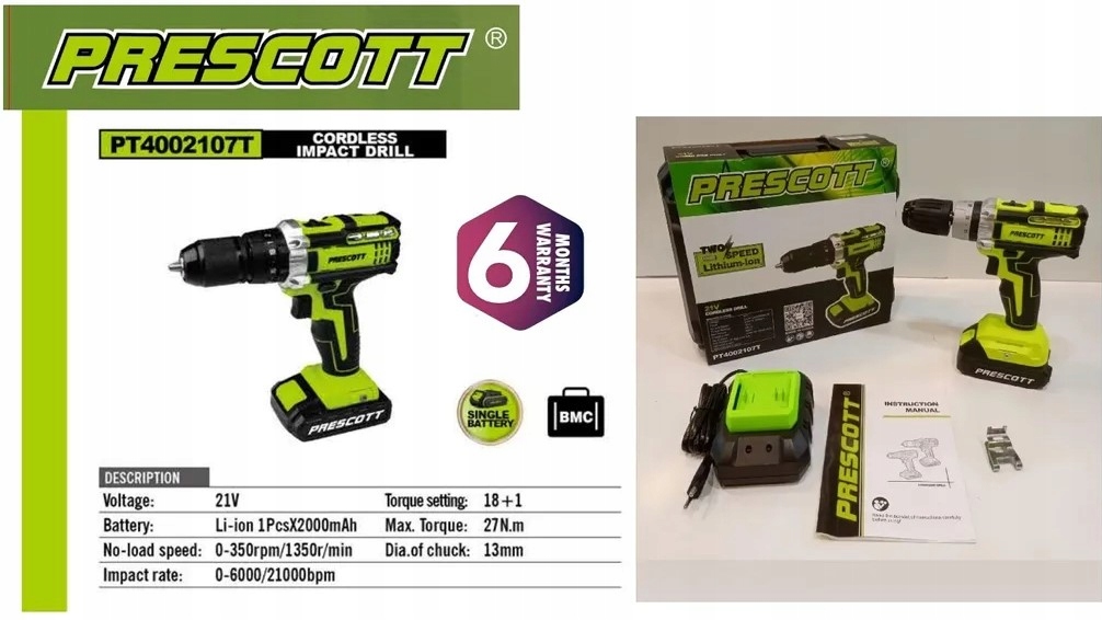 Потужний і універсальний дриль/шуруповерт на 21 В від PRESCOTT оснащений сучасним безщітковим двигуном постійного струму. у міцному сталевому механізмі. Ідеально підходить для свердління в металі, дереві та, завдяки ударній функції, також у бетоні, стіні чи камені. Широкий діапазон регулювань зчеплення значно полегшить вашу роботу при закручуванні шурупів. Це нова модель 2021 року з усіма необхідними функціями, які очікують сьогодні споживачі. Швидка зарядка, додаткова інтелектуальна літій-іонна батарея з індикатором заряду, світлодіодне підсвічування тощо.