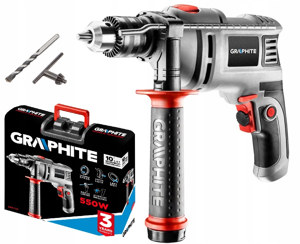 Універсальна ударна дриль GRAPHITE потужністю 550 Вт ідеально підходить для різання таких матеріалів, як дерево, пластик, метал і кераміка. Після переходу в режим ударного свердління свердління таких матеріалів, як бетон або цегла, буде однаково ефективним. Під час свердління дриль досягає до 3000 обертів за хвилину, а при включеному перфораторі частота ударів досягає 48 000 за хвилину. Електроінструмент має можливість повороту головки вправо і вліво. Ергономічний дизайн, невелика вага пристрою і довгий шнур живлення однозначно полегшать роботу у важкодоступних місцях. Прогумована основна ручка підвищує комфорт і безпеку роботи. Зберігання та транспортування спрощується завдяки відділенню для зберігання дрилі, розташованому в додатковій ручці, і практичній валізі.