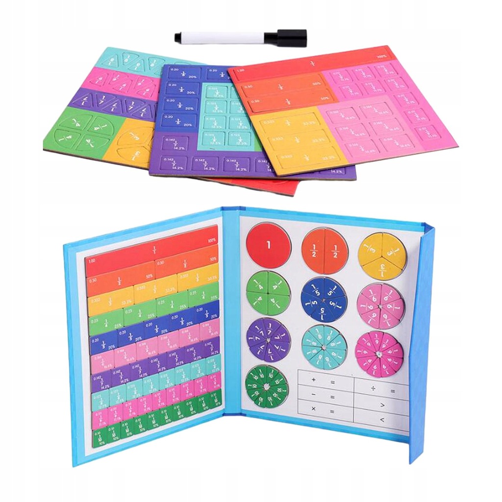 Магнітний навчальний пазл з дробами - містить 10 магнітних плиток з дробами (1 ціле число, 1/2, 1/3, 1/4, 1/5, 1/6, 1/7, 1/8, 1/9 і 1/10) і 10 магнітних кіл (1 ціле число, 1/2, 1/3, 1/4, 1/5, 1/6, 11 /7, 1/8, 1/9, 1/10), загалом 110 магнітних сегментів із числами в 10 кольори. Використовуйте їх окремо або разом, щоб задовольнити різноманітні навчальні потреби.