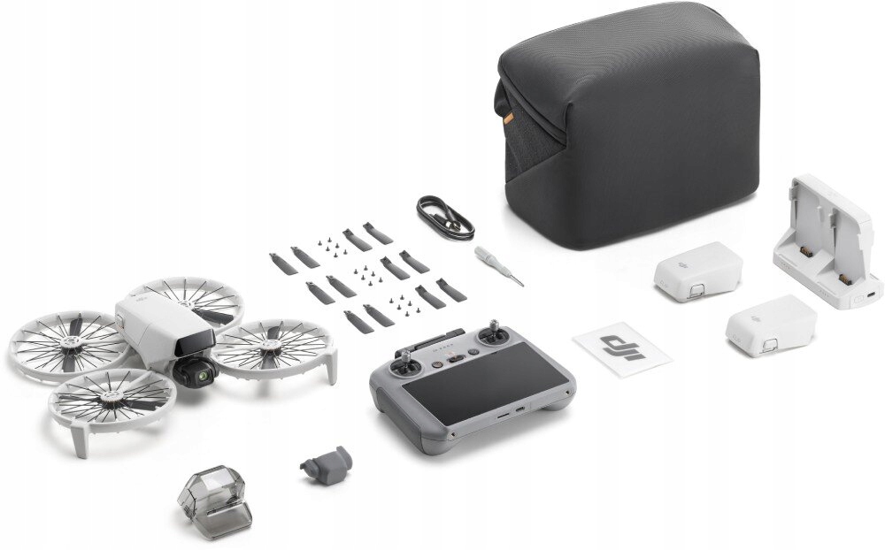 Пакет містить: безпілотник dji flip , DJI RC 2 управління, три інтелектуальні батареї, кришка гімбала, три пари гвинтів з гвинтами, викруткою, зарядкою Кабель USB-C-USB-C, сумка для плечей, зарядка та посібник користувача.