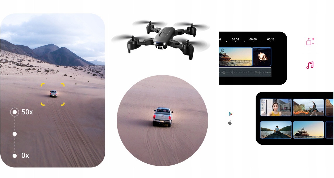 Дрон має найновішу камеру 4K WiFi HD з передачею FPV (зображення в реальному часі). Зображення з камери передається на смартфон під управлінням Android або iOS. Додаток доступний для Android та iOS. Установіть програму або відскануйте QR-код, доступний у посібнику користувача дрона, і запустіть попередній перегляд зображення.