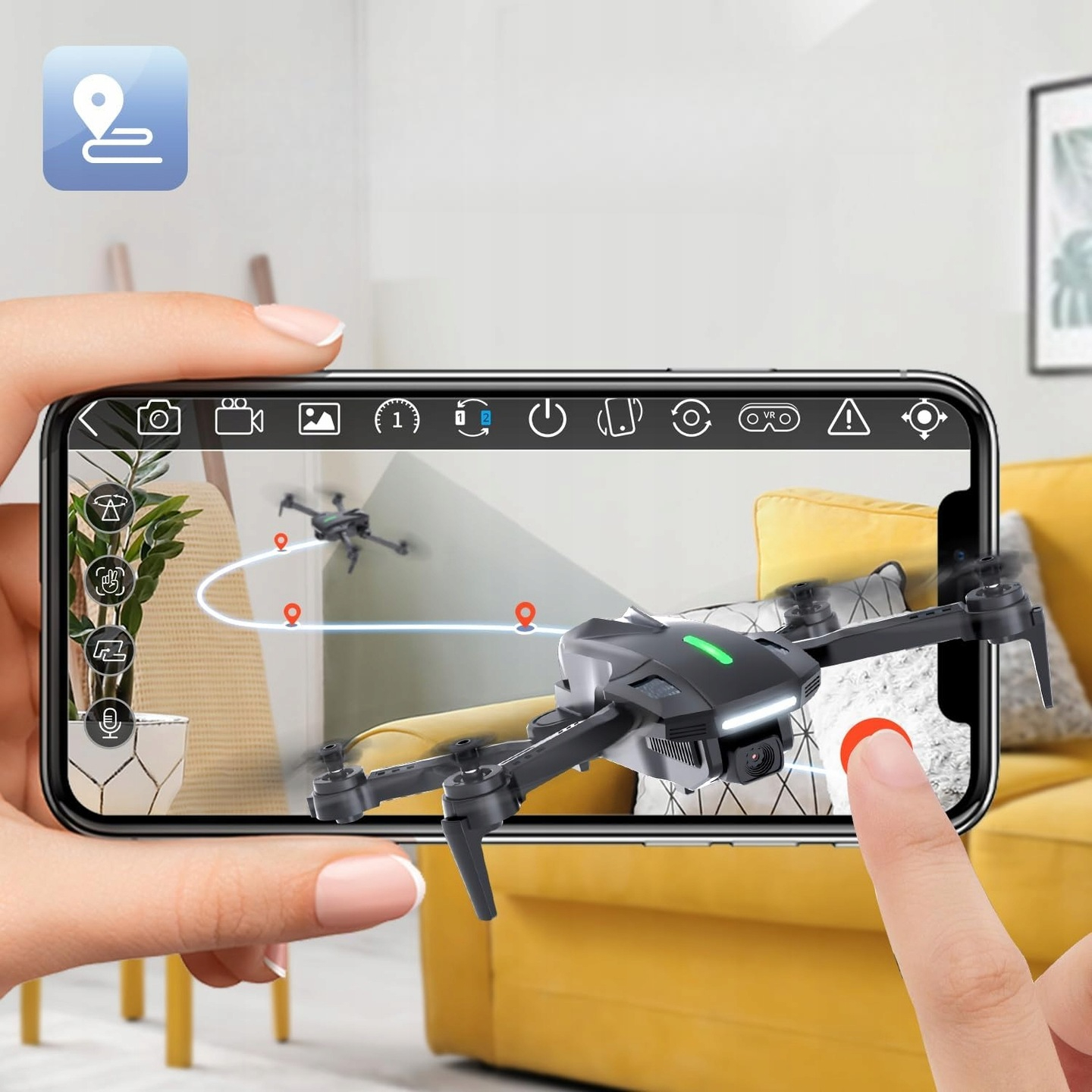 - Розширені функції креативного польоту: дрон D70 оснащений технологією Tap Fly, яка дозволяє малювати курс польоту на смартфоні та спостерігати за польотом дрона. За допомогою керування жестами ви можете робити фотографії та записувати відео, показуючи руку або знак V перед фронтальною камерою. Дайте волю своїй творчості та з легкістю робіть чудові аерофотознімки.