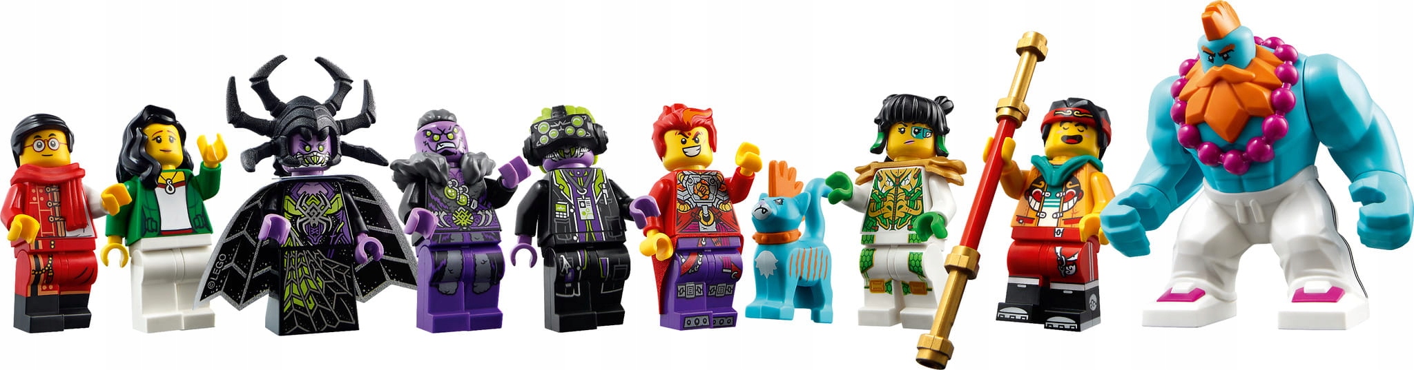 - Набір включає вісім мініфігурок: Monkie Kid, Mei, Mr. Тан, Мисливець, Синтаксис, Червоний син, Королева павуків і Фей. Плюс котики Сенді та Мо, надихаюча зброя та аксесуари.