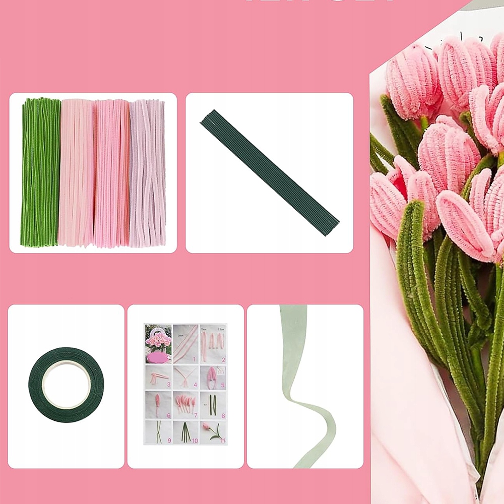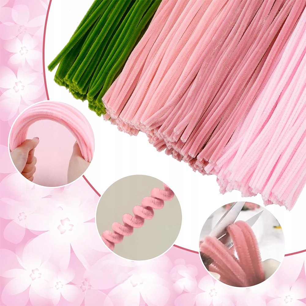 - 300 рожевих дротів з хутром: Від темних, глибоких відтінків (червоно-рожевий) до світлих, ніжних (рожево-білих) - для створення тюльпанів різних відтінків кольорів.