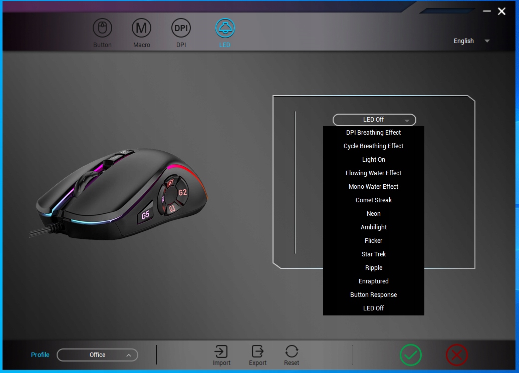 Світлодіодне підсвічування миші — це функція, яка освітлює нижню частину пристрою, надаючи йому стильний і футуристичний вигляд. Окрім візуального ефекту, світлодіодне підсвічування має також практичне застосування, оскільки полегшує використання миші при поганому освітленні.