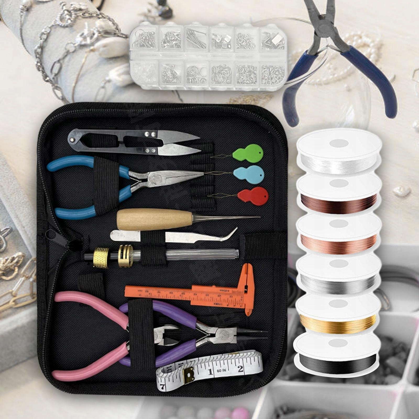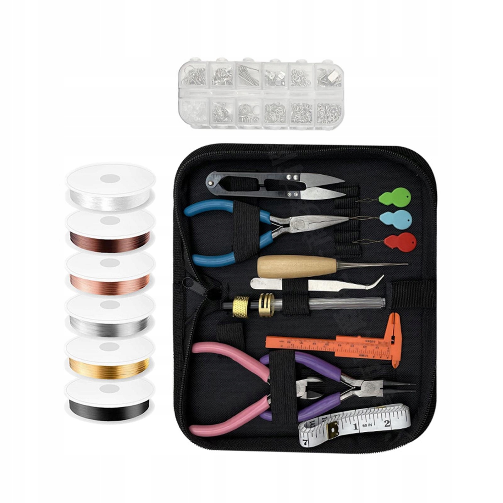 [всебічні]: Ці матеріали для виготовлення ювелірних виробів включають 3 ювелірні плоскогубці, 5 мідних дротяних валиків, 1 прозора струна з намистинами, 6 шт. ножиці. Набір також включає міру, нитки та корпус, який полегшує зберігання. Кожна з них оснащена подвійною пружиною та нею ручками, що забезпечують безпечне та ефективне використання. Чорний. Ці матові дроти ідеально підходять для створення кольє, браслетів, сережок або інших ювелірних дизайнів. 6 мм/8 мм), карабіни, стилетки з вушками, вушками з вушками, намистинами, сережками, гачками, стрічками тощо, що забезпечує всі необхідні елементи для створення прекрасних творів. ]: Виготовлений з високоякісного металу, він тривалий час служить, і в той же час забезпечує зручність наявності всіх інструментів на місці.