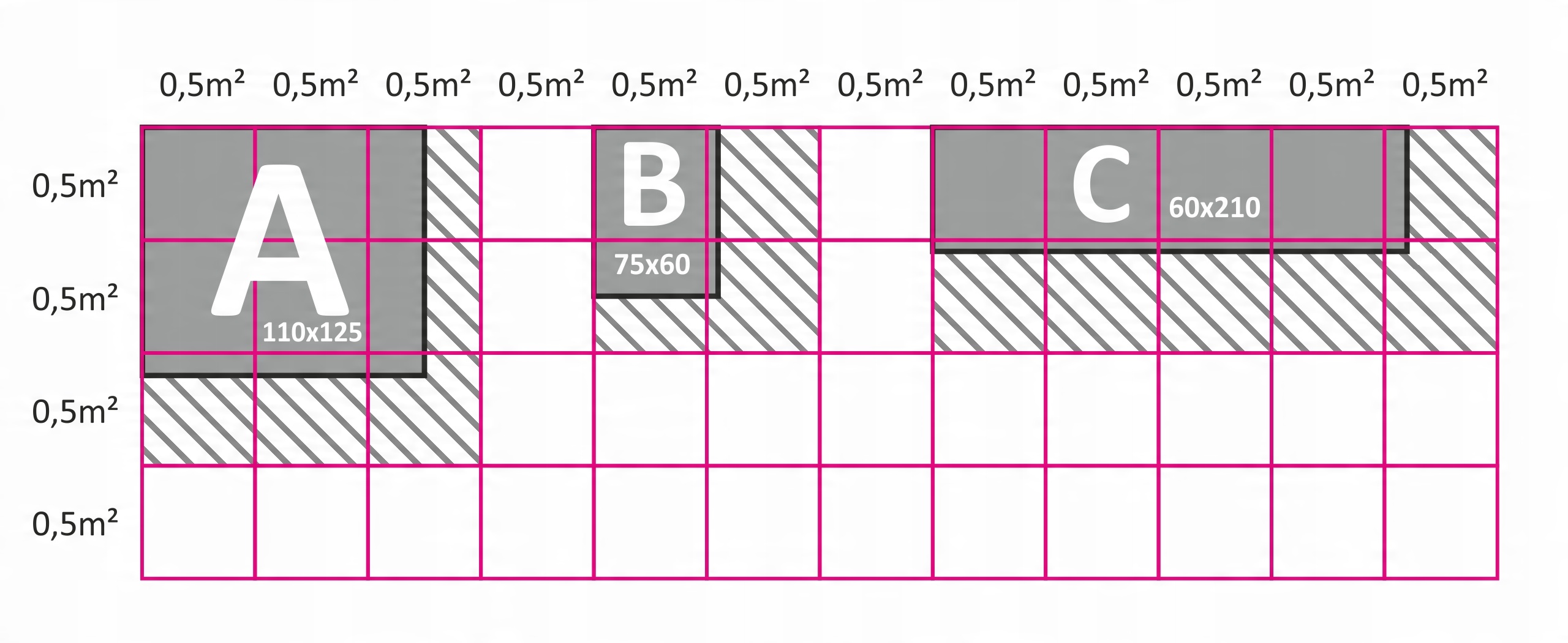 Мінімальне замовлення становить 0,5 м2, округлене в більшу сторону (нижче наведено графік, який показує, як рахувати).