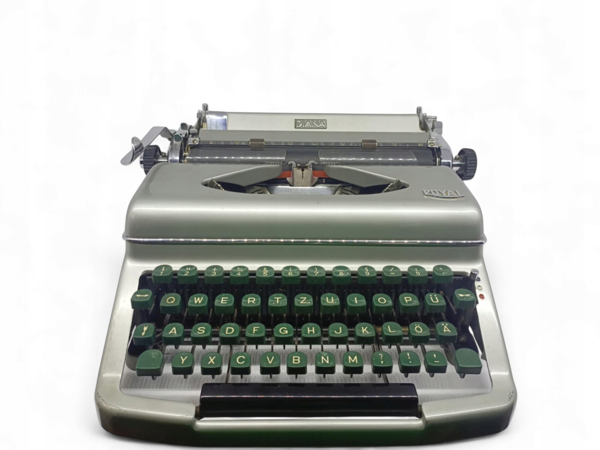 Королівська Діана 1950 + випадок. Пристрій знаходиться в дуже хорошому технічному та візуальному стані, повністю функціональному та готовому до написання. У ньому є макет клавіатури Qwertz для німецької мови. Набір включає оригінальний шкіряний корпус, який також зберігається у чудовому стані. Це відмінний вибір для людей, які цінують старовинний та ретро -клімат. Стан пристрою