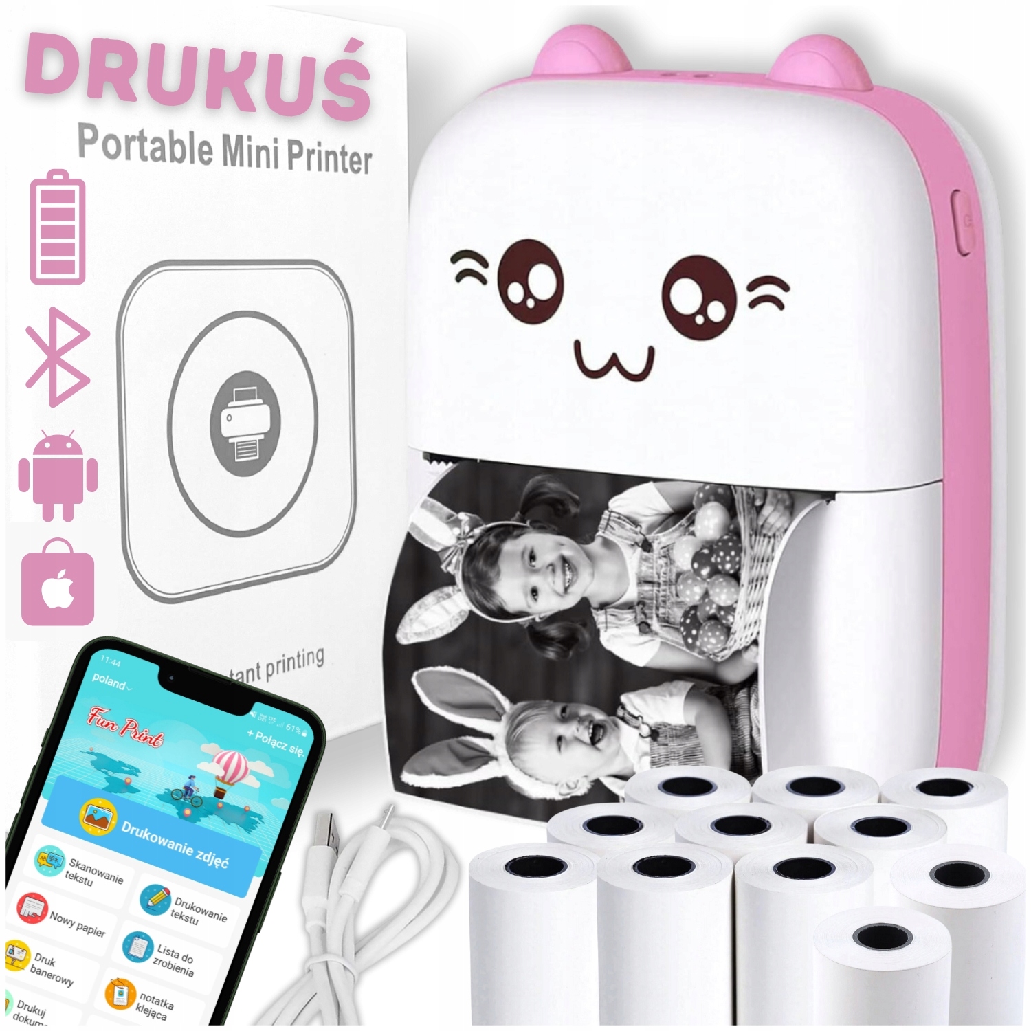 DRUKUŚ МІНІ ПОРТАТИВНИЙ ТЕРМОПРИНТЕР ДЛЯ ФОТОГРАФІЙ ЕТИКЕТОК + ПАПІР 11 РОЛИКІВ