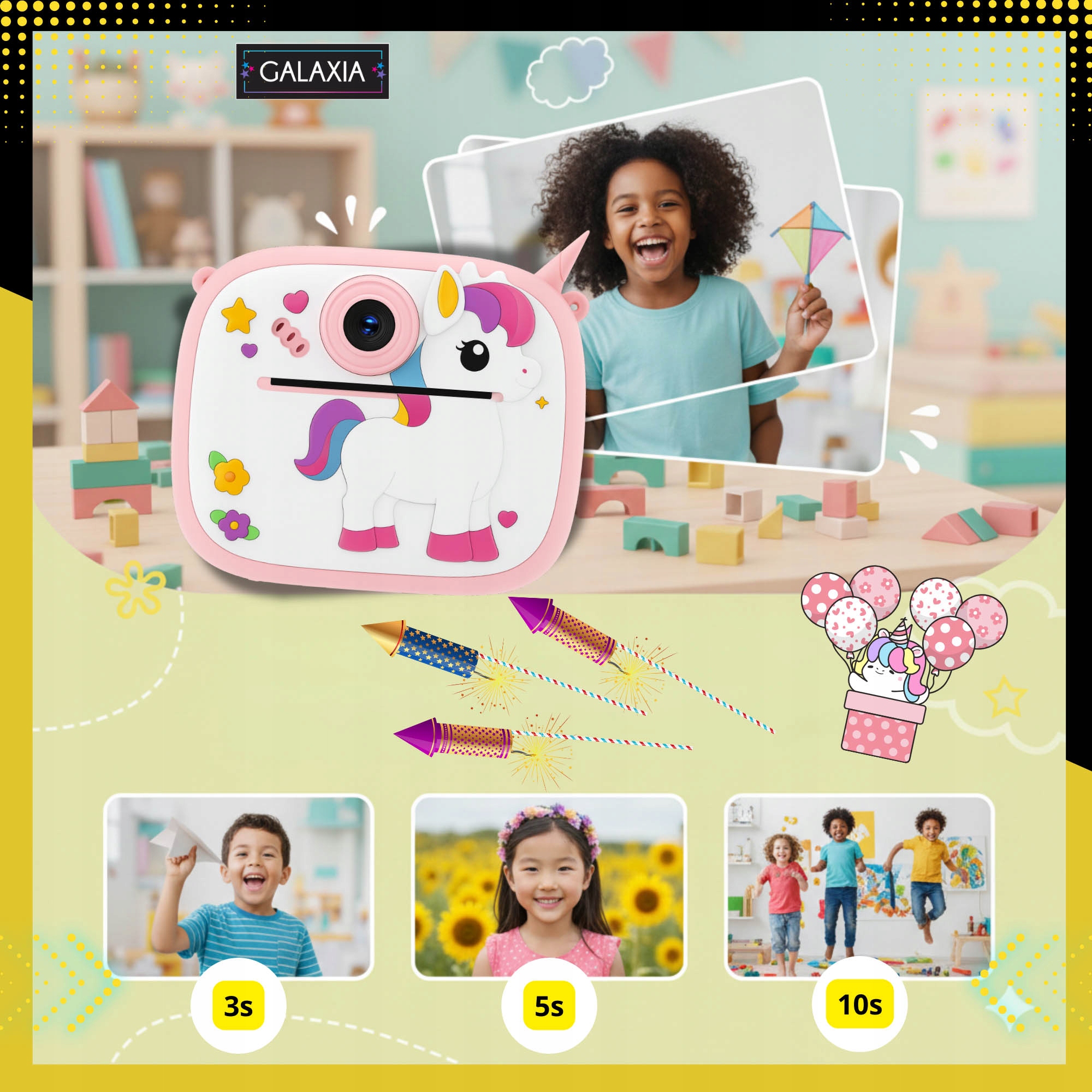 Незалежно від того, фотографує дитина повсякденне життя, грає з братами та сестрами, у відпустці чи на дні народження – фотоапарат GALAXIA® є обов’язковим для маленького творець. Легкий, зручний, із захисним силіконовим корпусом і миттєвим друком, він працює всюди: вдома, у дворі, у парку, в машині та на шкільних екскурсіях.