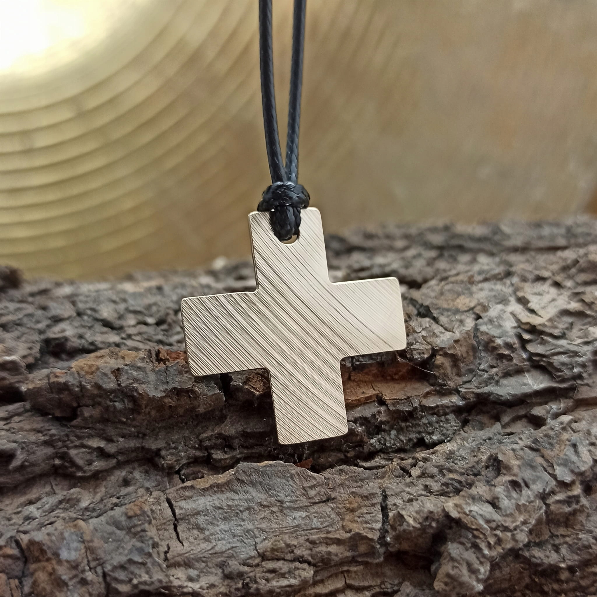 Намисто з хрестом підвішено на вощеній нитці та має популярне регулювання довжини за допомогою двох вузлів.