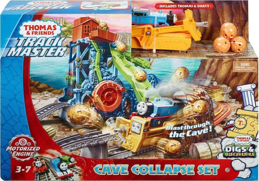 Ігровий набір Thomas & Friends TrackMaster Cave Adventure натхненний епізодами 23-го сезону телесеріалу Thomas & Friends! Блакитний потяг готовий до роботи, а допомагає йому новий колега — майнінгова машина Дар’я. Поверніть рукоятку, щоб Томас міг піднятися на ліфті наверх. Досягнувши вершини, ваш улюблений блакитний локомотив несподівано сповзає по спусковій доріжці прямо на шахтарську машину Дар’я! Томек їде на машині, приводячи її в рух. Обертова насадка Дарії відхиляє блокуючі «валуни», коли друзі їздять по печері! «Валуни» падають на трасу при повороті рукоятки. Томек і Дарія — це динамічний дует, який ідеально підходить для виконання складних завдань під керівництвом дитини!