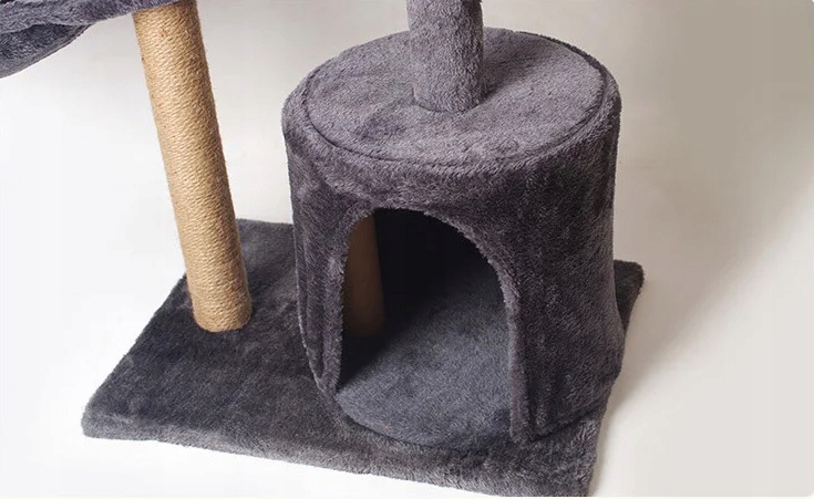 М'який пухнастий матеріал дуже добре кріпиться до платформ, немає шансів відірватися навіть після тривалого використання. Стовпи конструкції обплетені ниткою з сизалю, що дозволить точити кігті!