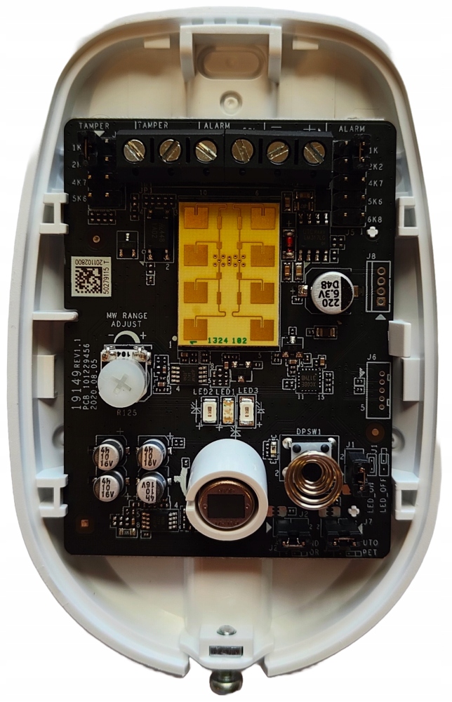 - Метод виявлення: PIR (подвійний) піроелемент) + MW (мікрохвильовий доплерівський датчик)