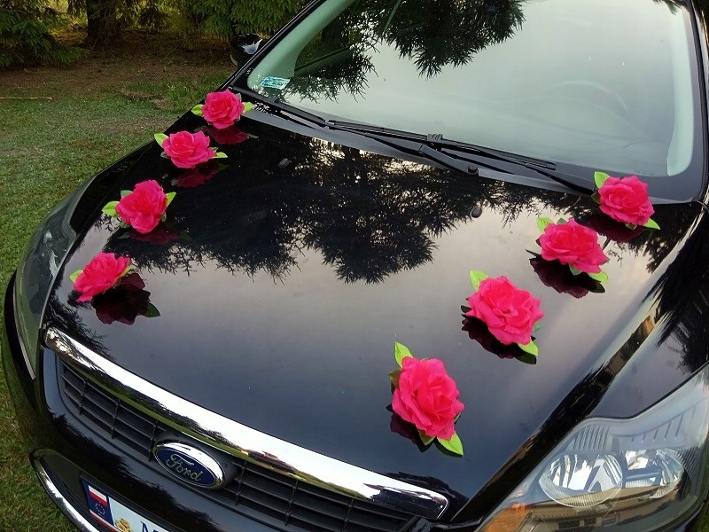 Квіти можна розмістити на капоті автомобіля будь-яким способом, створюючи різноманітні прикраси.
