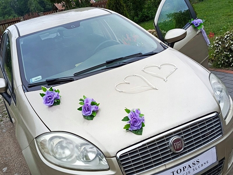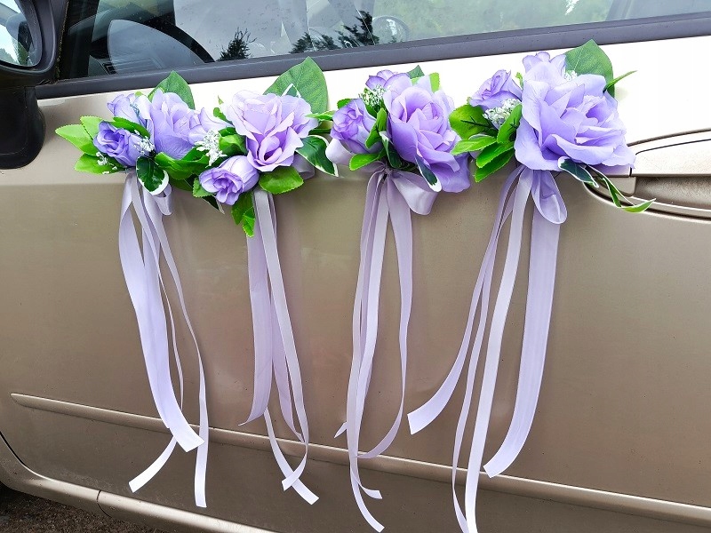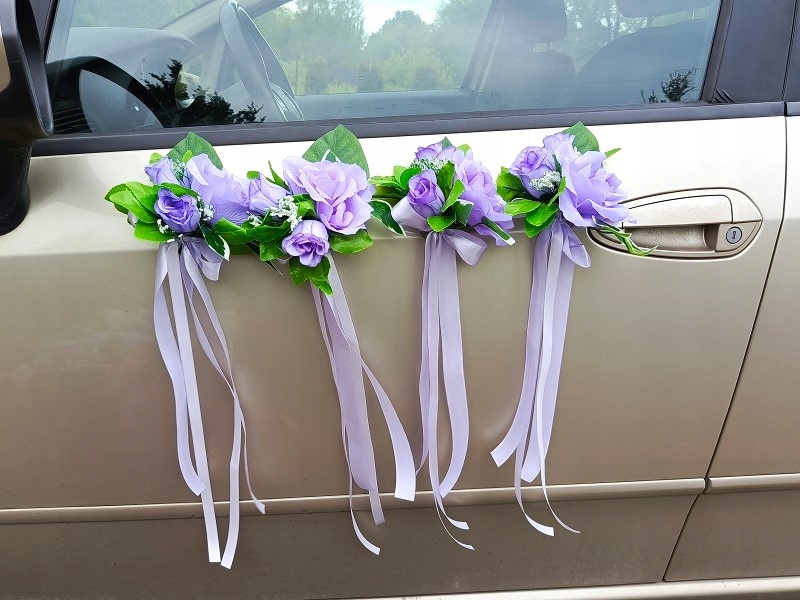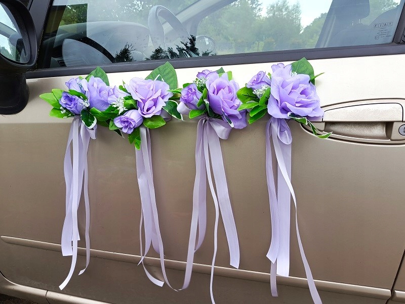- чотири букети на дверних ручках; кожен букет складається з фіолетових троянд і зеленого листя, прикрашених фіолетовими стрічками. Розмір букета (без стрічок) - прибл. 17см х 14см. Довжина прикраси зі стрічками - прибл. 43 см.