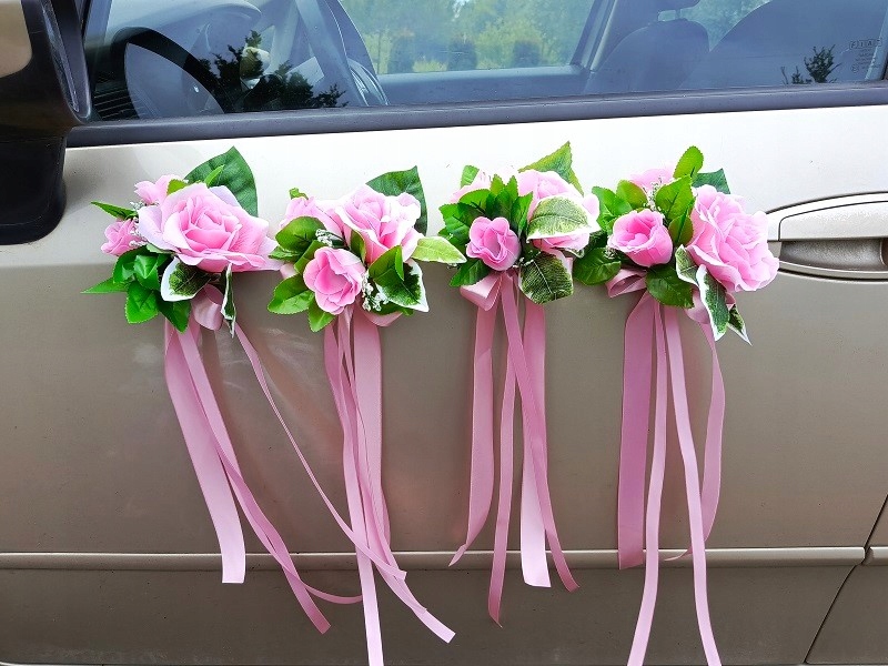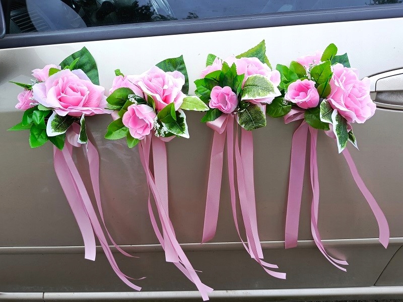 - для дверних ручок; Кожен букет виготовлений із світло -рожевих троянд і зелених листя, прикрашених яскраво -рожевими стрічками. Розміри букетів (без стрічок) - прибл. 17 см х 14 см. Довжина прикраси стрічками - бл. 43 см.