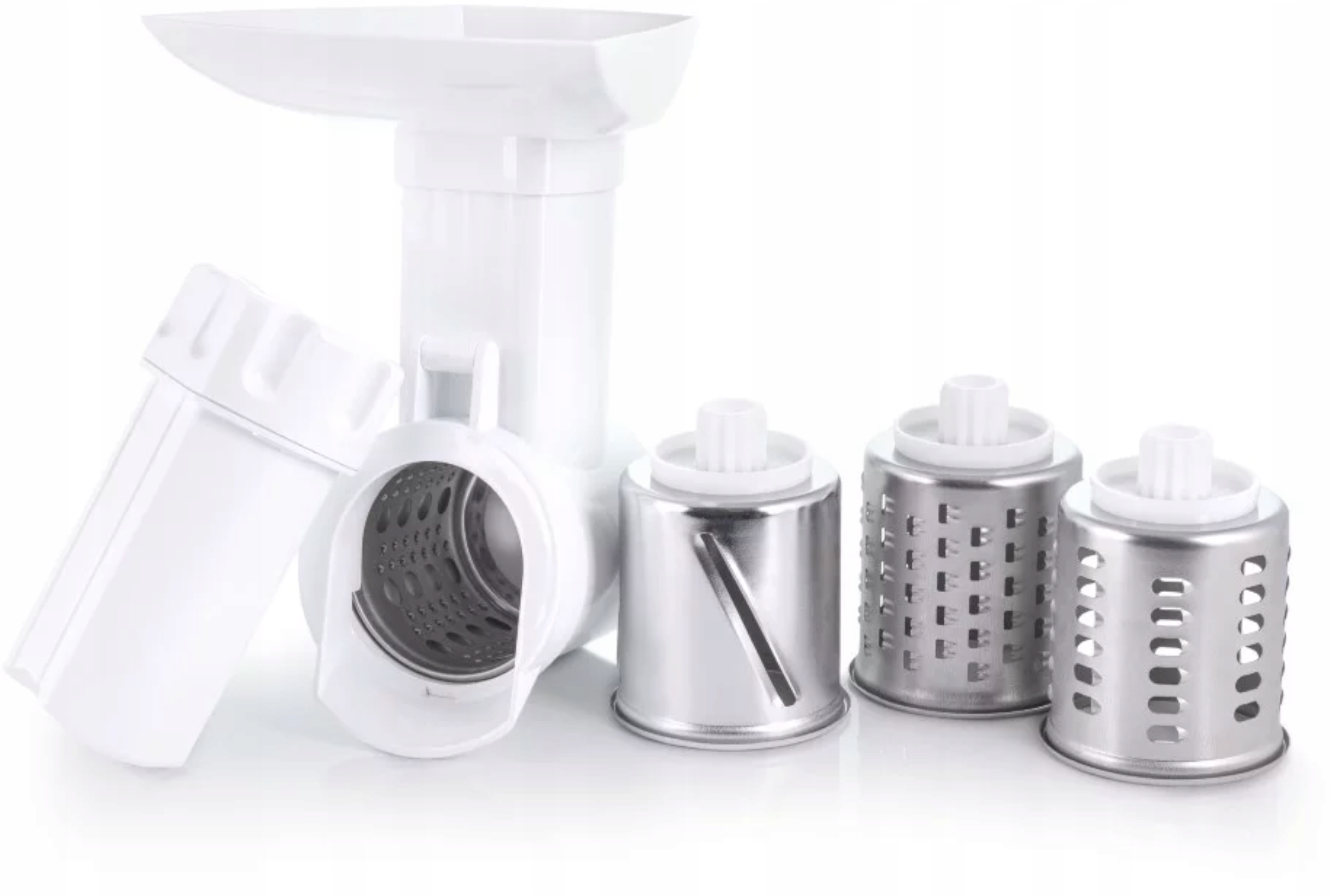 Слайсер марки WELCO. Адаптований до м'ясорубок ZELMER, ZELMOTR, SMAPP І BOSCH. Обладнання подрібнювача однозначно розширює функціональні можливості подрібнювача - дозволяє швидко натирати картоплю, приготувати салати, терти сир і > подрібнення на скибочки та стружку. У набір входить: штовхач, чаша сервірувальна, камера, засувка камери, 4 терки (груба стружка, дрібна стружка, пюреровка, нарізка скибочками). Тертки виготовлені з нержавіючої сталі.