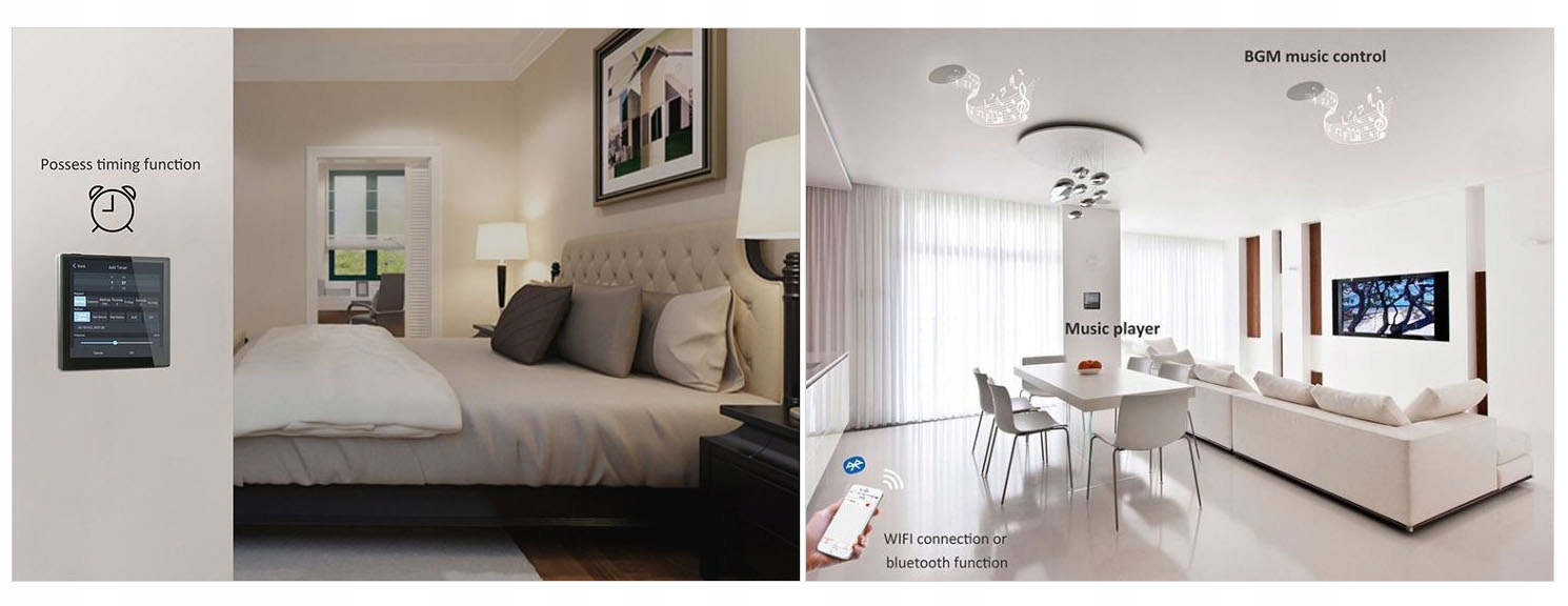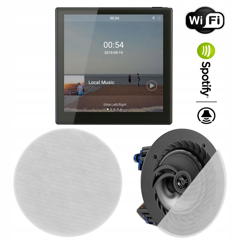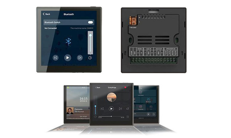 Важливою функцією набору є можливість відтворення аудіо із зовнішніх пристроїв через карту Micro SD (формати аудіофайлів: MP3, WMA, WAV, AAC і FLAC.) або бездротовим шляхом за допомогою BLUETOOTH. Невеликі розміри і елегантний дизайн з глянцевим покриттям і кольоровим IPS LCD дисплеєм з підсвічуванням і сенсорним екраном дозволяють легко вписати пристрій в інтер'єр квартир, офісів, готелів, ресторанів і т.д. Дуже проста установка пристрою - просто підключіть блок живлення 230 В і динаміки. За бажанням замовника систему можна розширити будь-якою настінною або прихованою колонкою. Пристрій також забезпечує передачу звуку по мережі DLNA/AIRPLAY, панель має функцію INTERCOM. Крім того, завдяки доступу до Play Store можна встановлювати такі програми, як Youtube або Firefox.