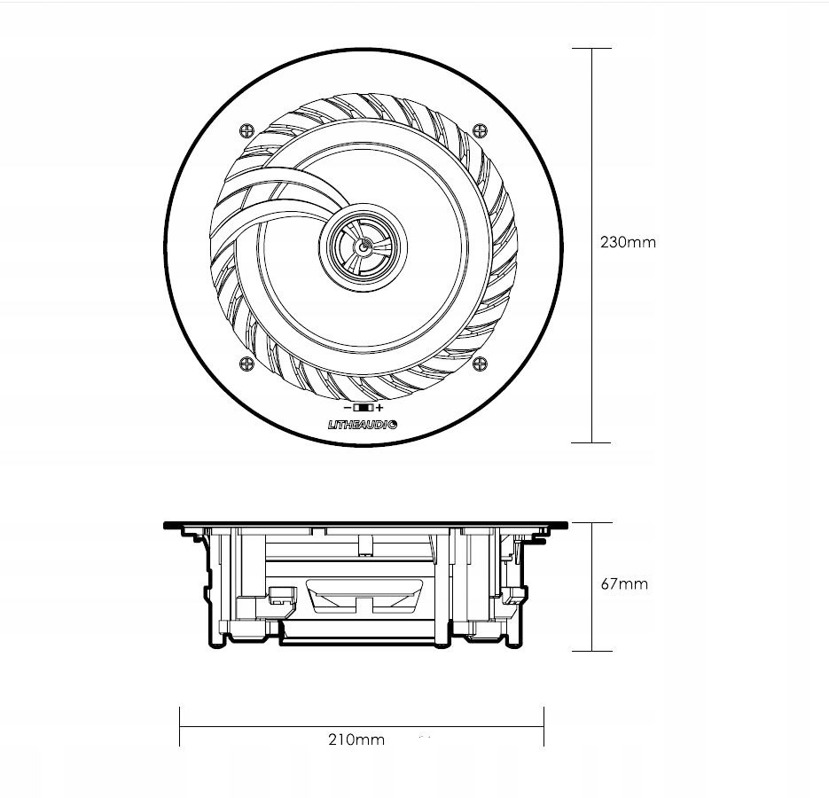 Щоб встановити стельові динаміки, просвердліть два отвори діаметром 210 мм і підключіть обидва динаміки за допомогою кабелю динаміків, що входить у комплект, до підсилювача/настінної панелі. Необхідна глибина для установки гучномовця становить 67 мм.