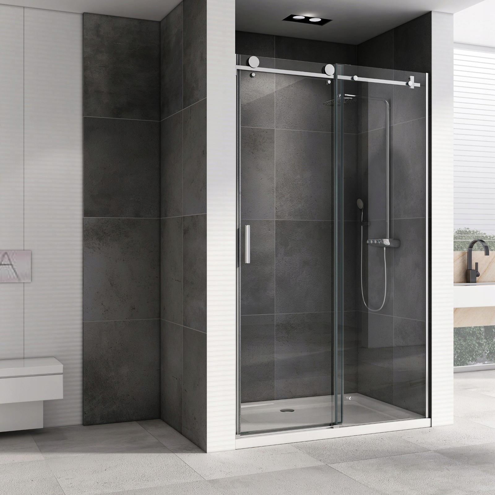 Розсувні двері з загартованого скла товщиною 8 мм, покритого покриттям Nano Easy Clean. Це забезпечує їм бездоганний зовнішній вигляд, довговічність і стійкість до всіх видів пошкоджень. Двері створювалися з урахуванням індивідуальних вимог користувачів. Вони відрізняються високою якістю та надійністю в роботі.