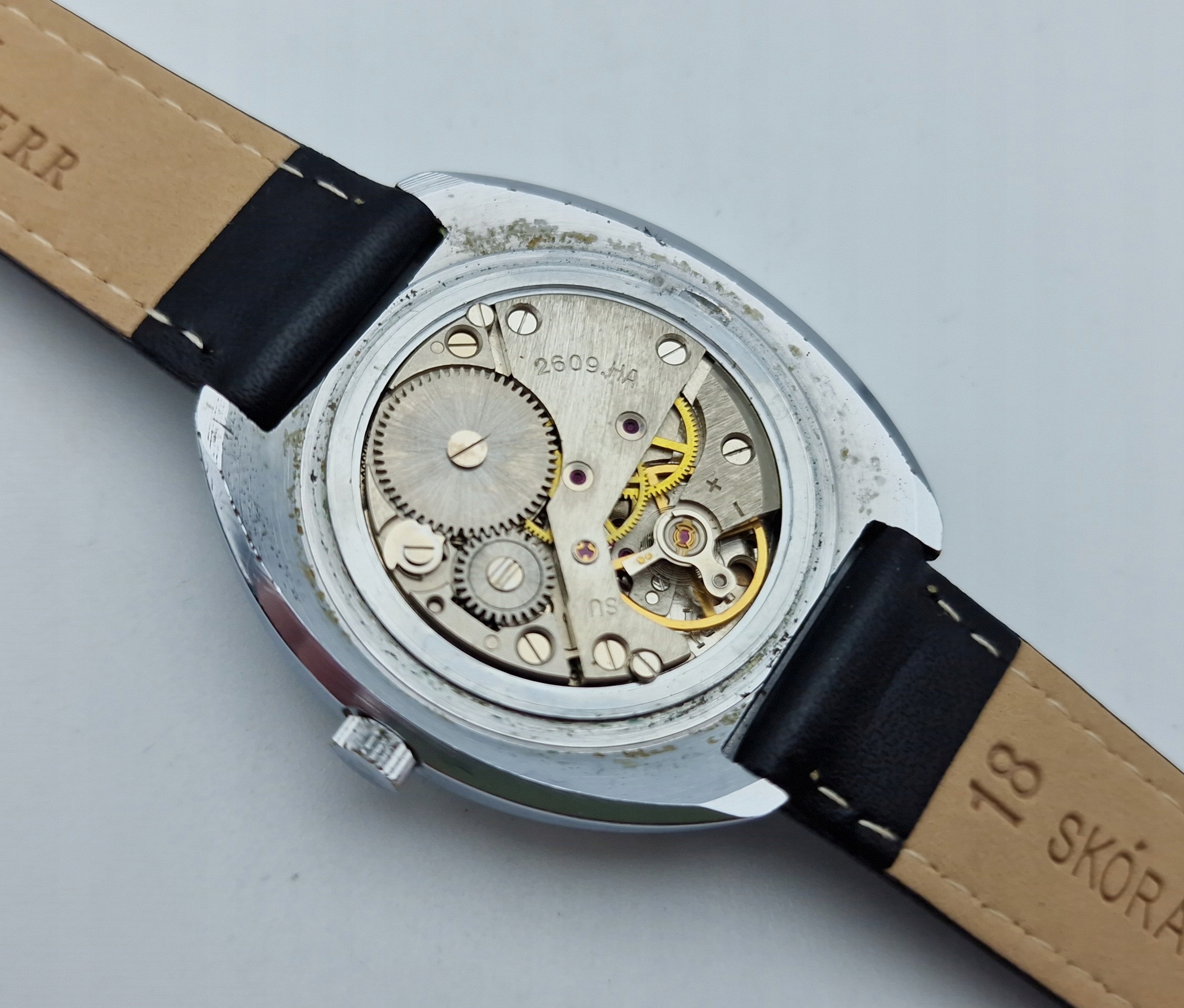 - Механізм годинника з 18 коштовностями, з анкерним спуском, підписаний логотипом компанії та написами: «2609ha, SU». Механізм працює добре, його перевірив годинниковий майстер і він у відмінному стані.