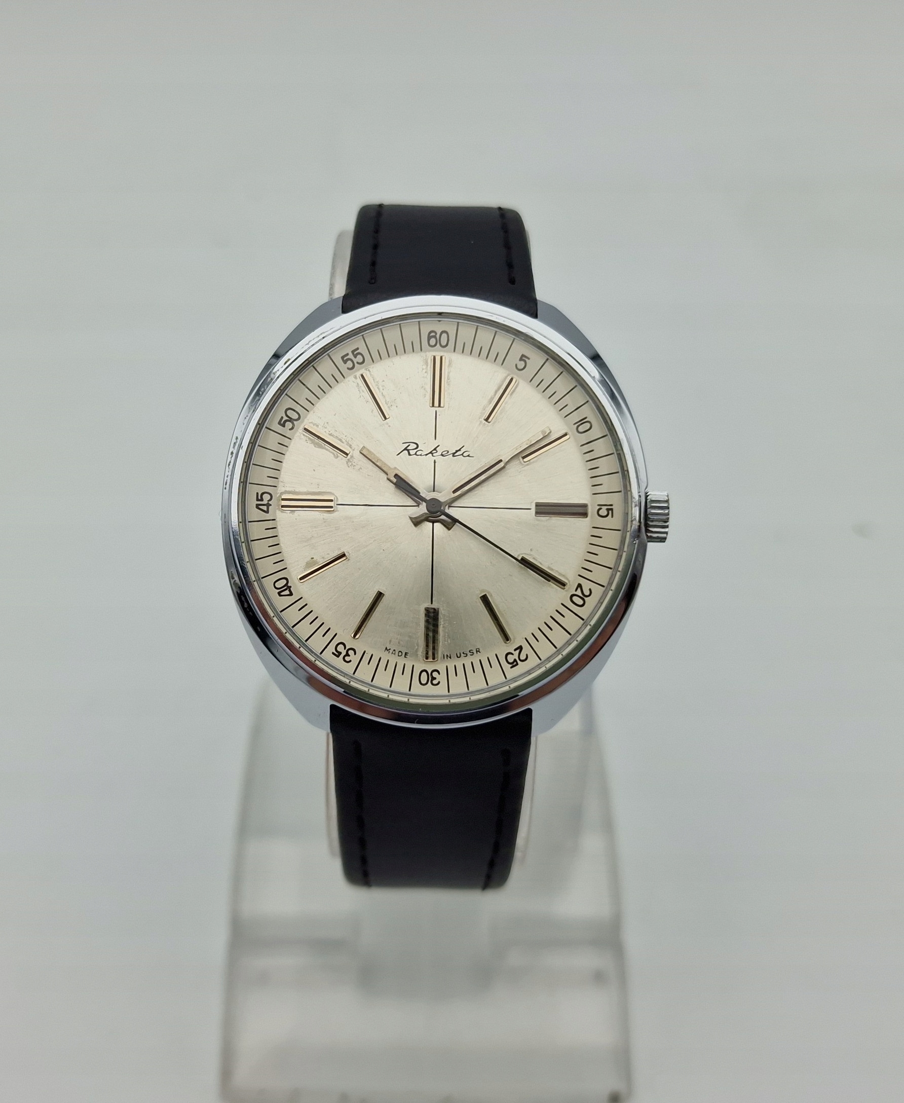 - Срібний металевий циферблат із чорними годинниковими мітками. На щиті підпис: «РАКЕТА ВИРОБНИЦТВО СРСР». Циферблат майже в ідеальному стані, як на фото.