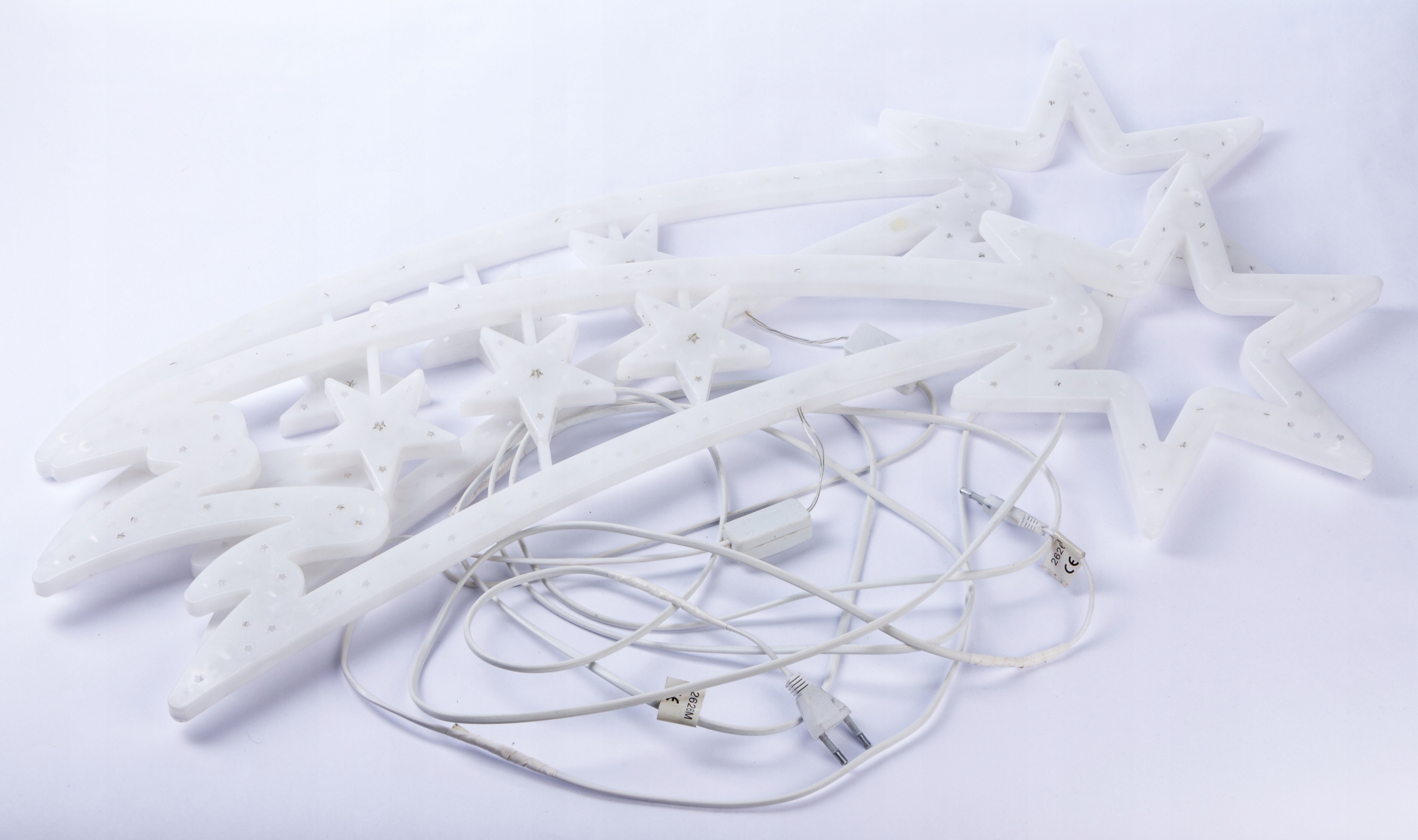 - Декоративна велика комета, що сяє різнокольоровими світлодіодами. Має два гачки для легкої установки. Вся річ зроблена з білого матеріалу.