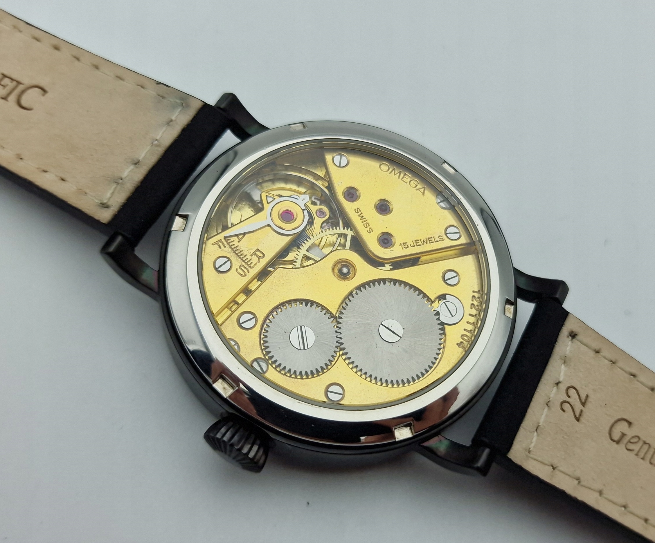 - Механізм годинника з 15 дорогоцінними каменями, зі швейцарським якорем, з підписами: "OMEGA, 15 JEWELS, SWISS, 12211104". Механізм був перевірений і обслуговувався майстром годинників, працює добре і пунктуально, і знаходиться у відмінному стані.