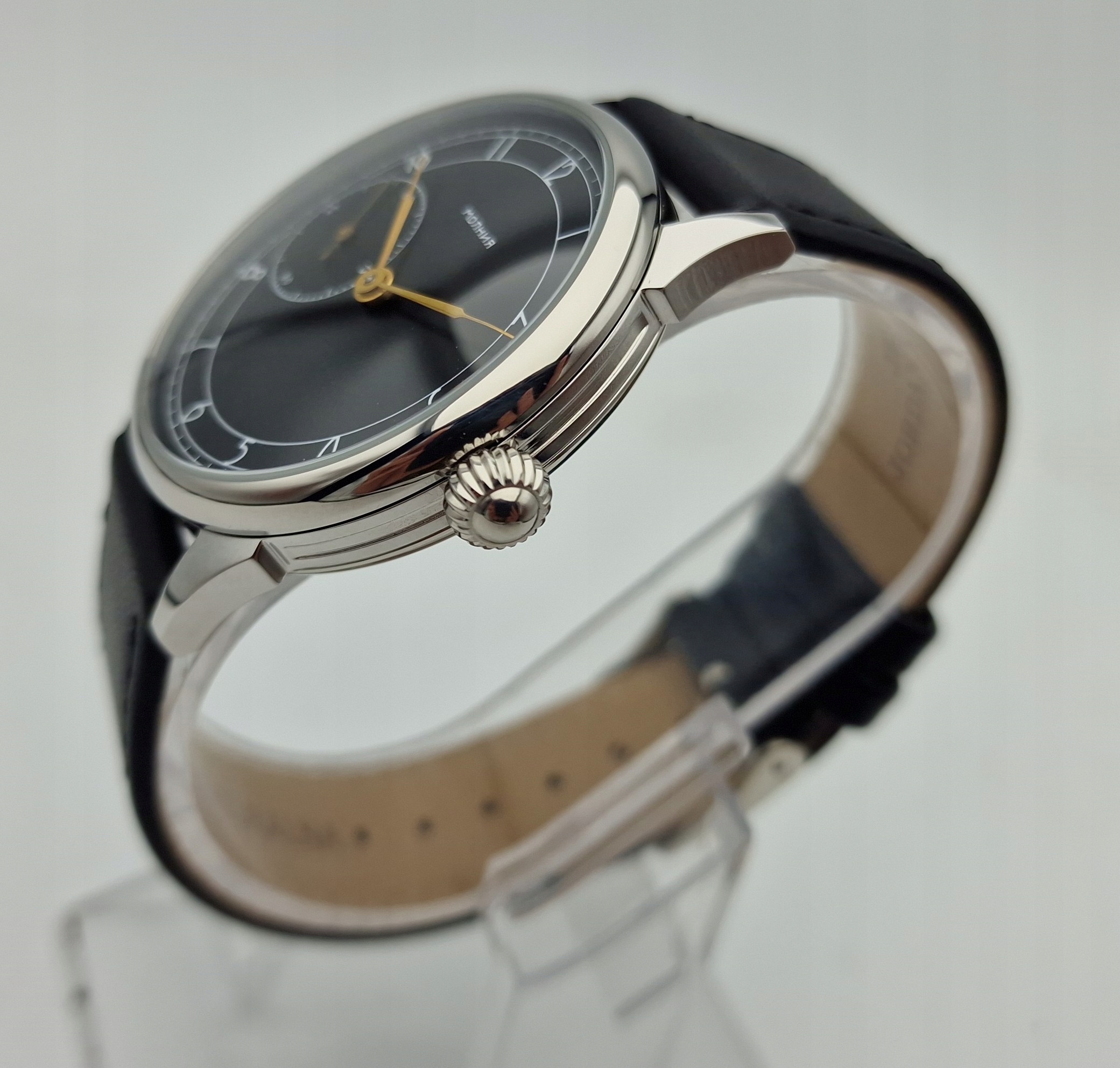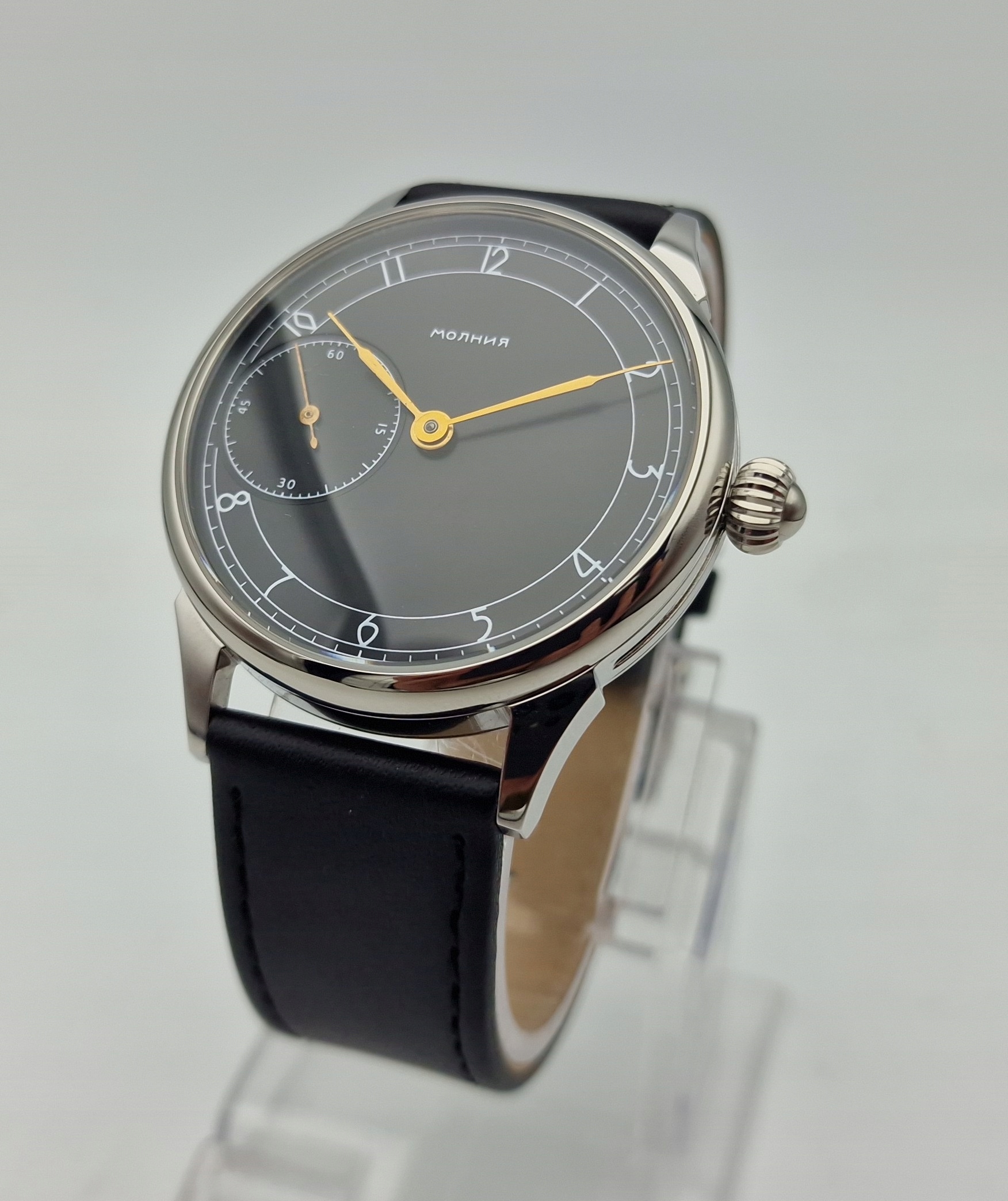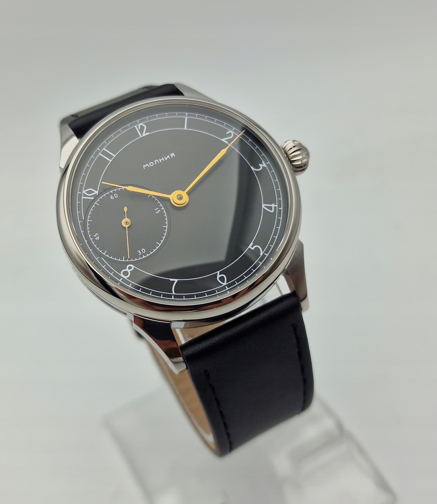 - Чорний циферблат з арабськими цифрами та окремою секундною стрілкою на дев’ятій годині з підписами: «MOLNIJA». Циферблат у ідеальному стані, як показано на фотографіях з аукціону.