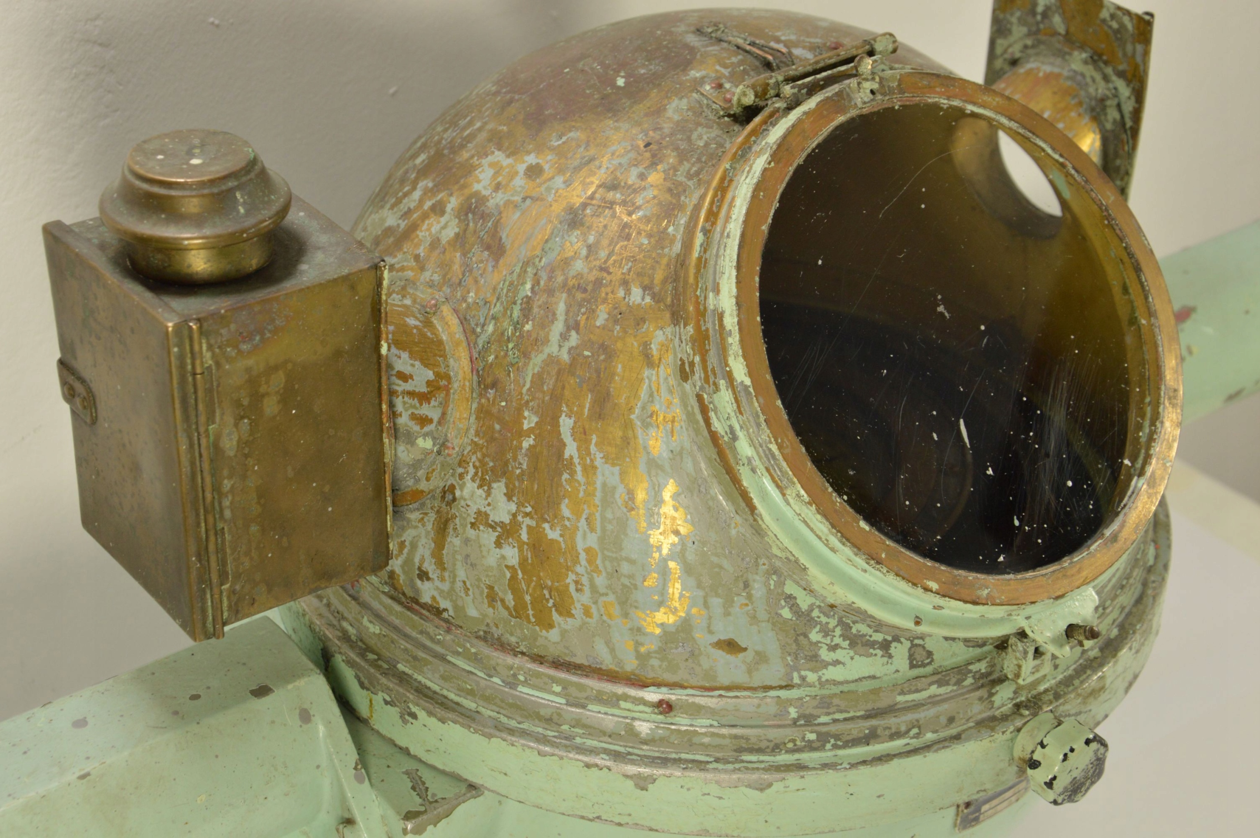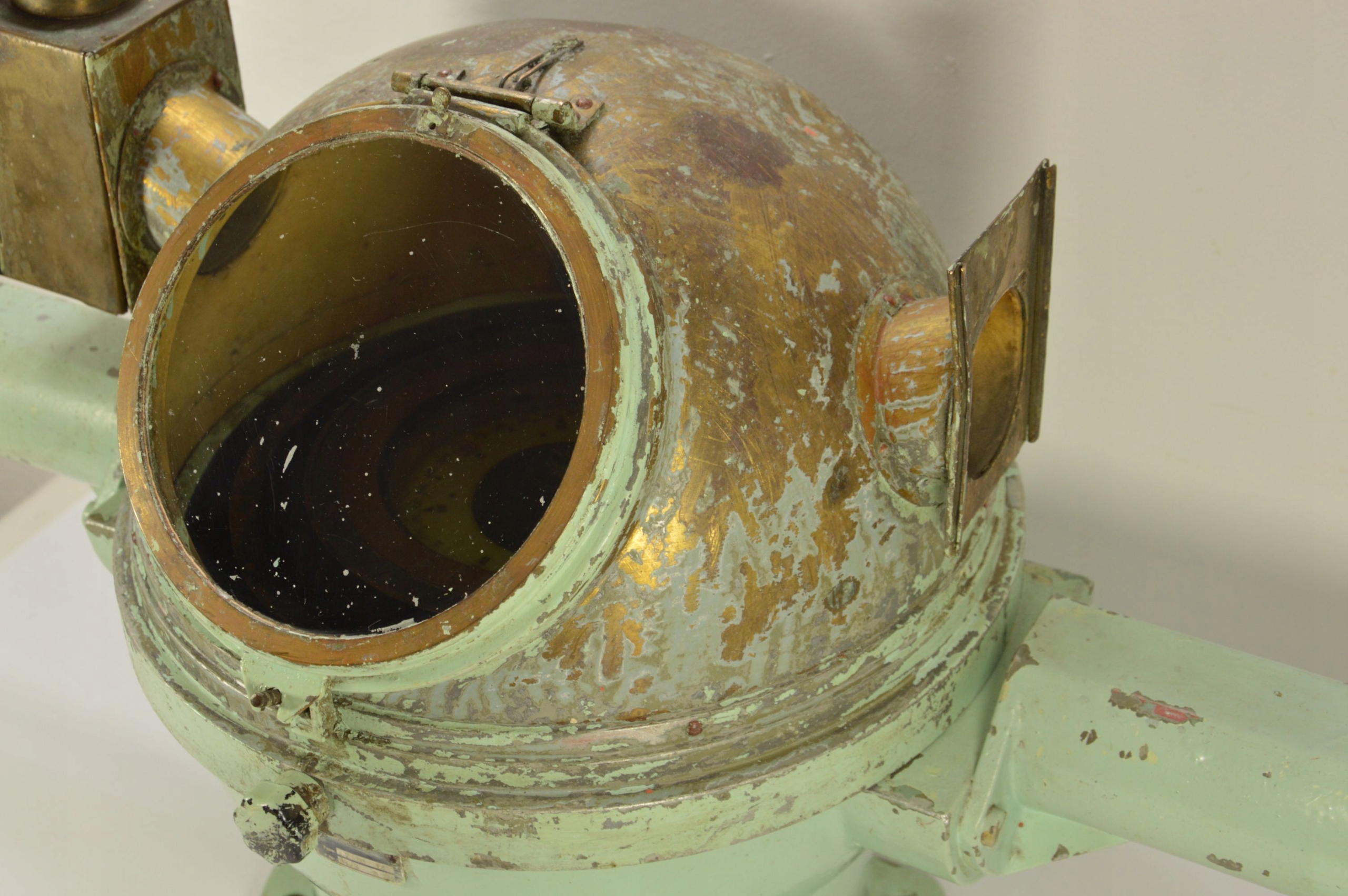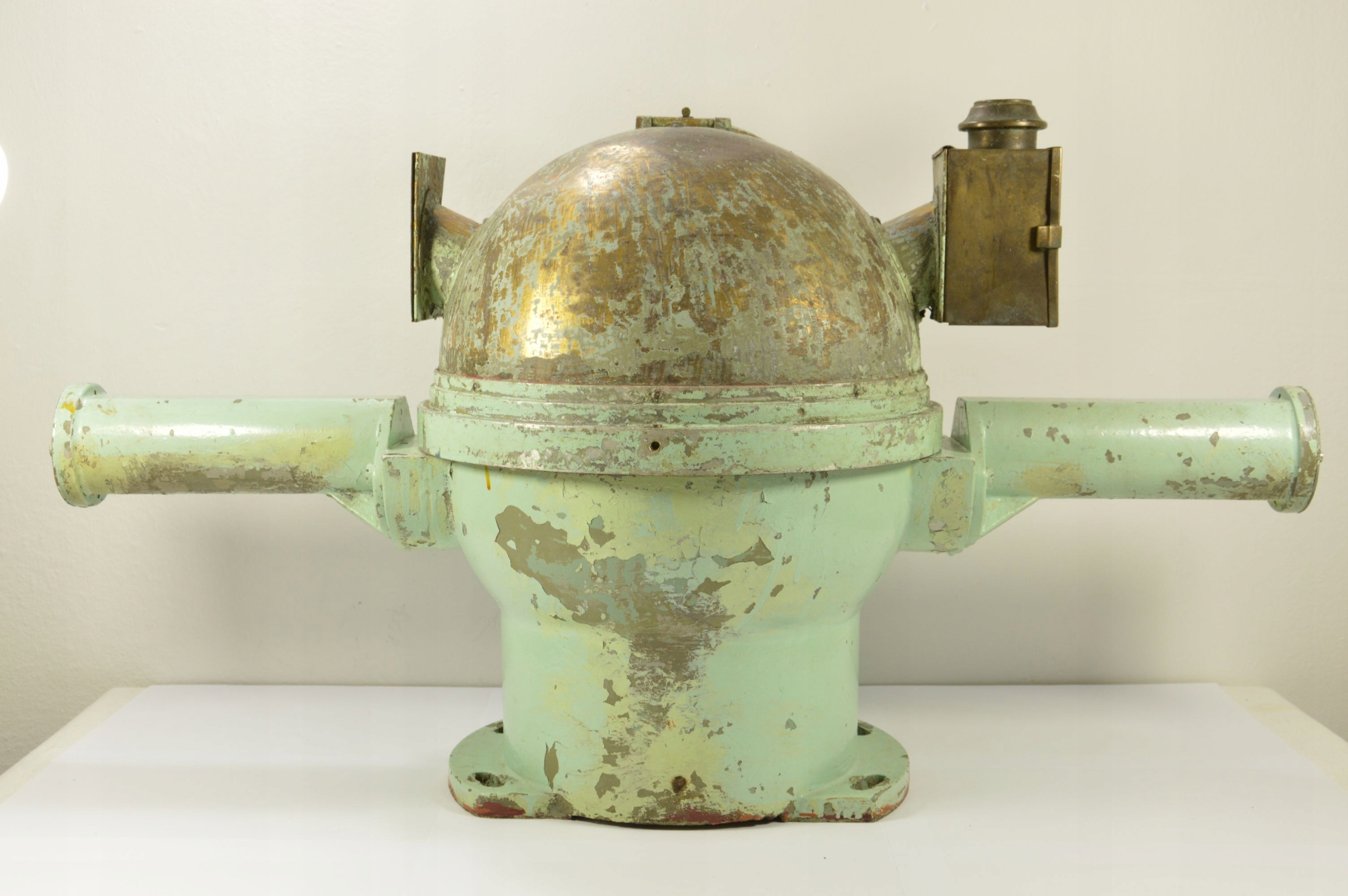 Оригінальний, старий, великий судновий компас VEB Geräte und Regulwerk (GRW) Teltow. Компас із підписом, виготовлений у 1950-х роках за довоєнним проектом Карла Бамберга, повністю справний. Оригінальний корпус з табличкою, одна гасова лампа зліва (лампа з оригінальною вставкою та гнотом). Видно сліди зняття старої фарби з купола. На тильній стороні купола дві невеликі вм'ятини, купол не пошкоджений. Дуже цікавий і оригінальний предмет епохи.