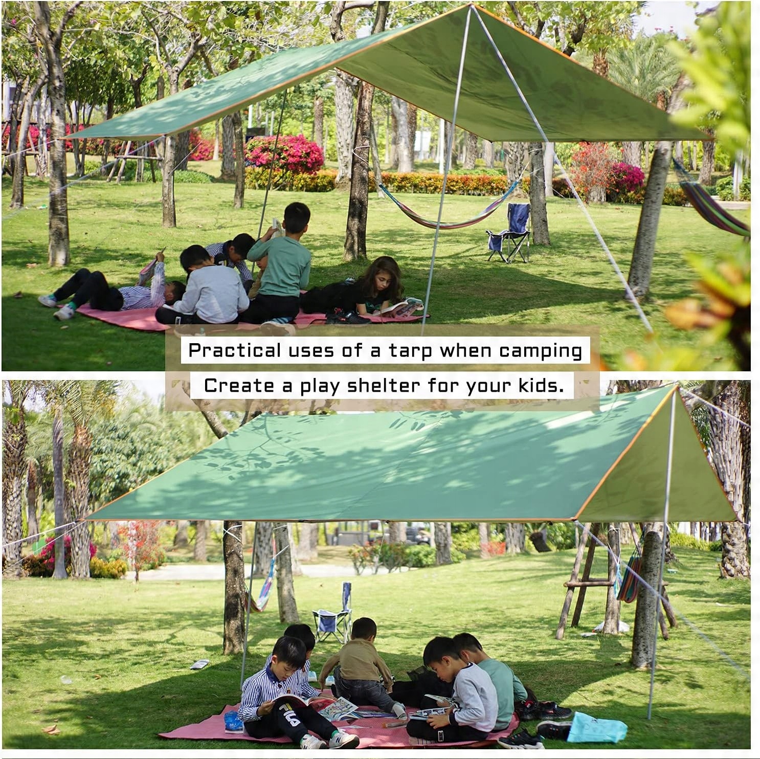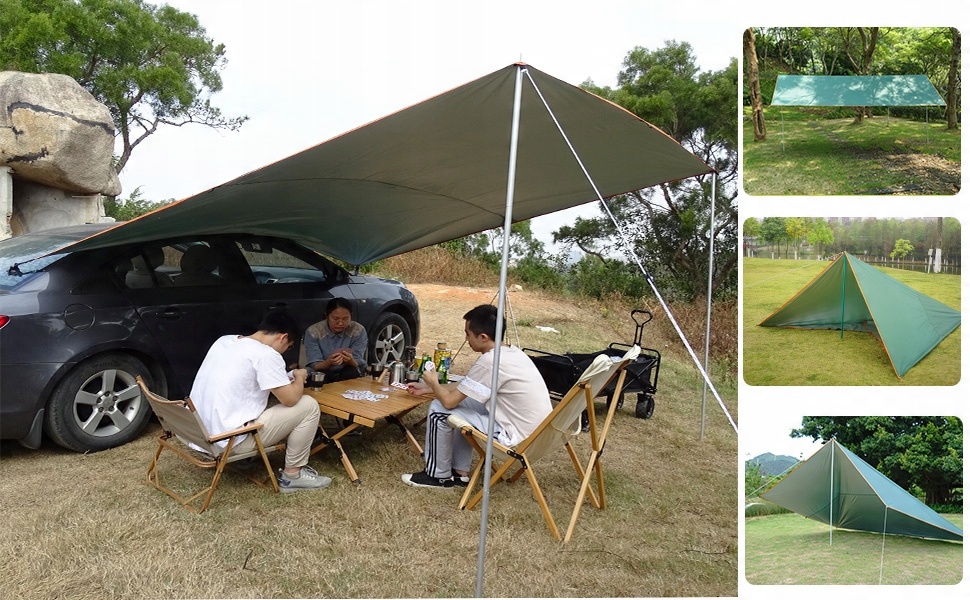 Брезент для кемпінгу Top Lander можна широко використовувати як брезент для виживання, укриття для бушкрафтів, гамак, брезент для подорожей, брезент для походів, укриття для приготування їжі на відкритому повітрі, поверхню для наметів, майданчик або намет для ігор для ваших дітей. У набір входить 6 колів і 6 мотузок, 2 алюмінієві телескопічні жердини, завдяки яким ви можете легко встановити різні фігури, навіть для того, хто ніколи раніше не встановлював брезент намету.