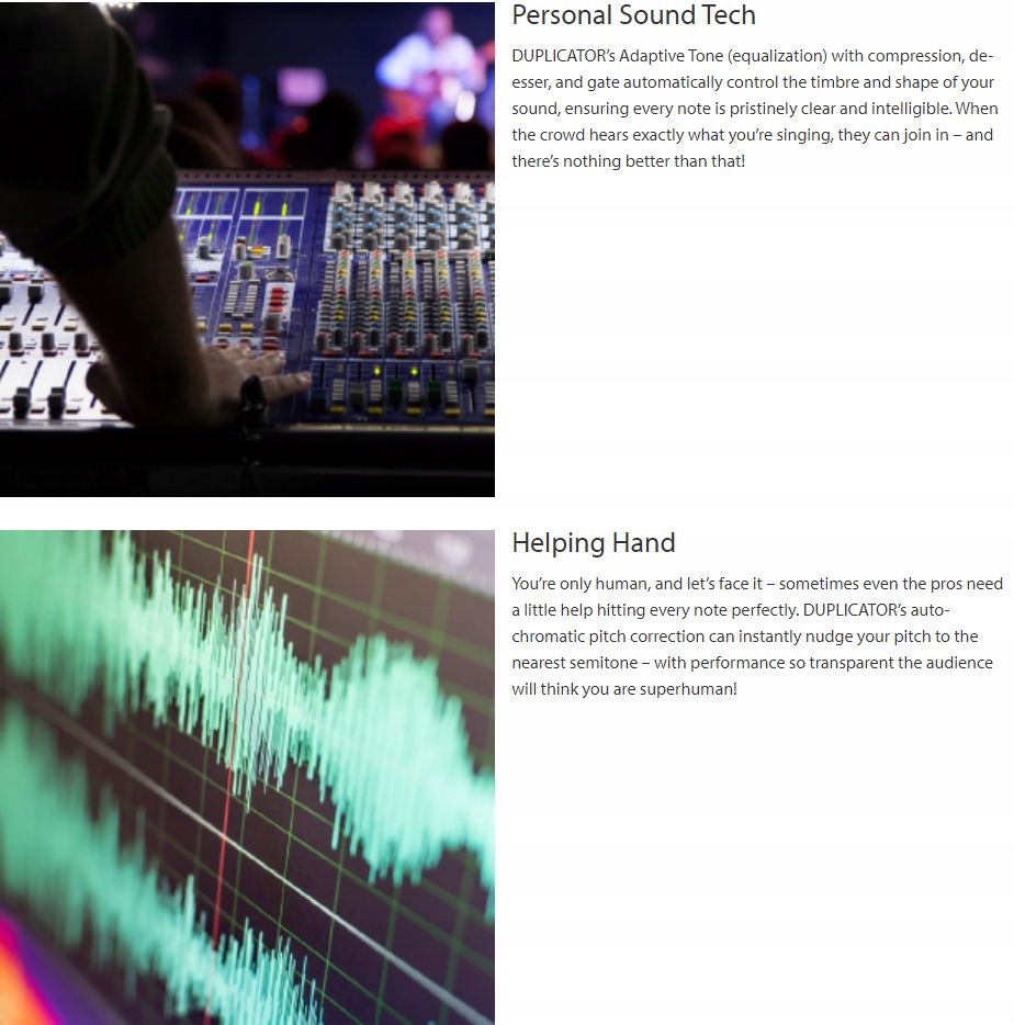 Подвоєння треків було відоме в студійних технологіях майже завжди. Це додає яскравості та емоцій у потрібних місцях, згущуючи ваш запис, як ніякий інший ефект. Але Duplicator — це не лише фантастичний двійник; також пропонує три унікальні реверберації та автоматичну корекцію інтонації. Duplicator дозволяє додати цю дивовижну функцію до ваших живих виступів, додаючи голоси ближче, далі або на октаву нижче, щоб надати вашим пісням більше життя.