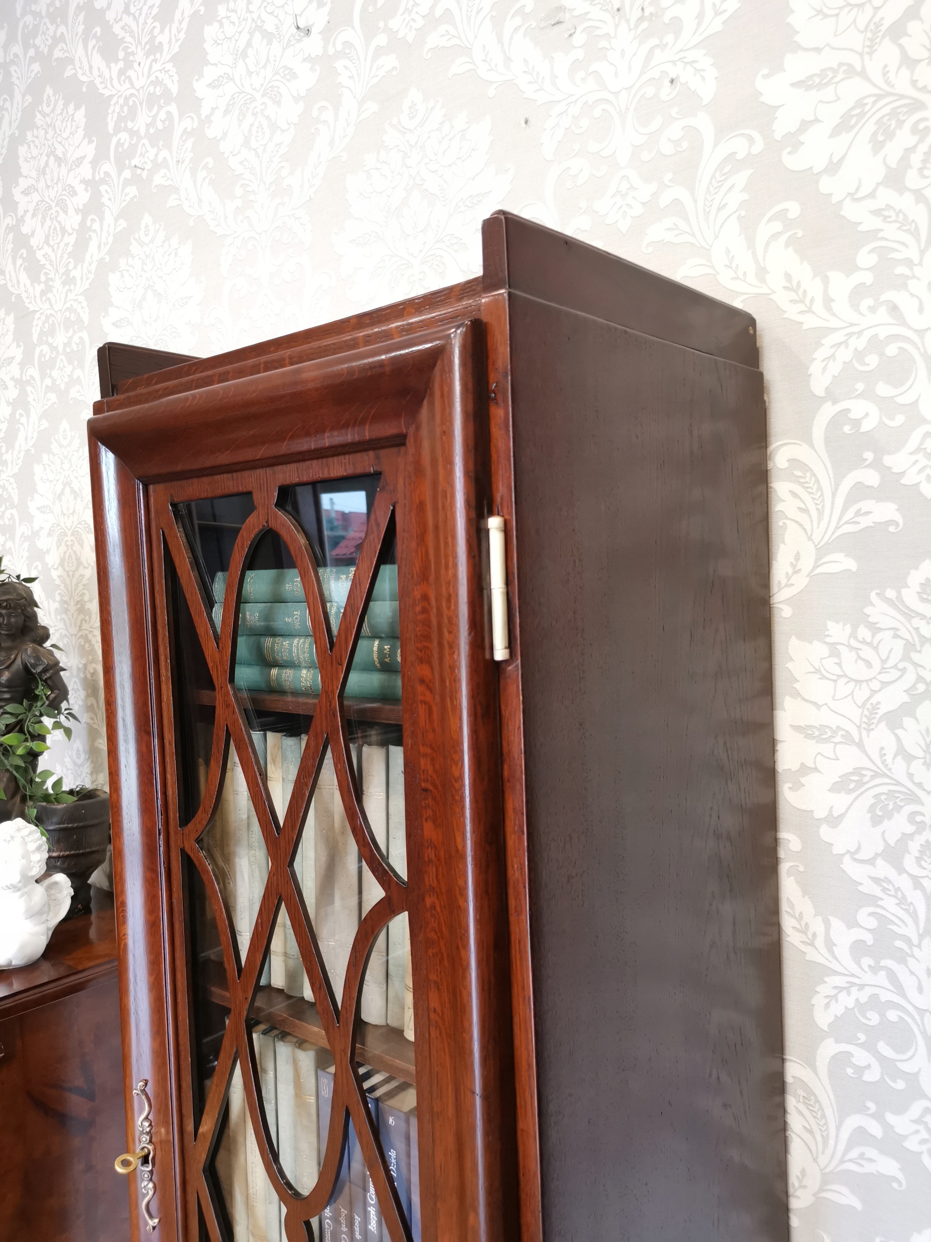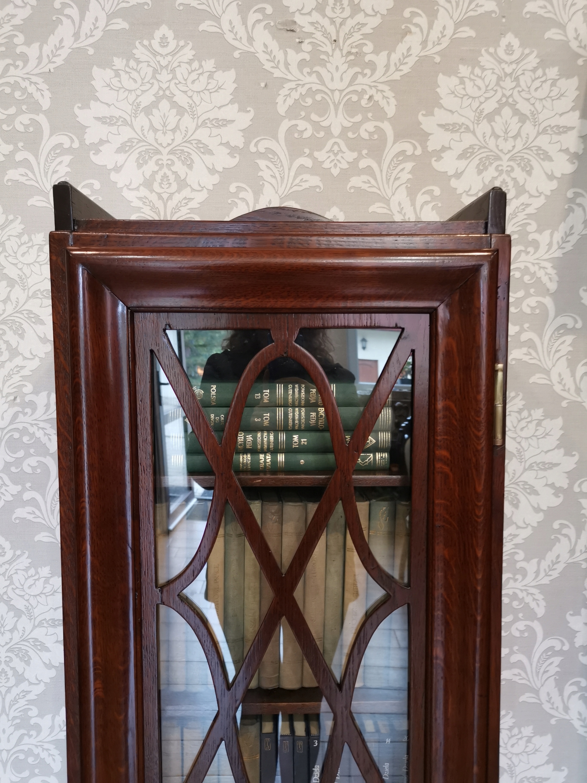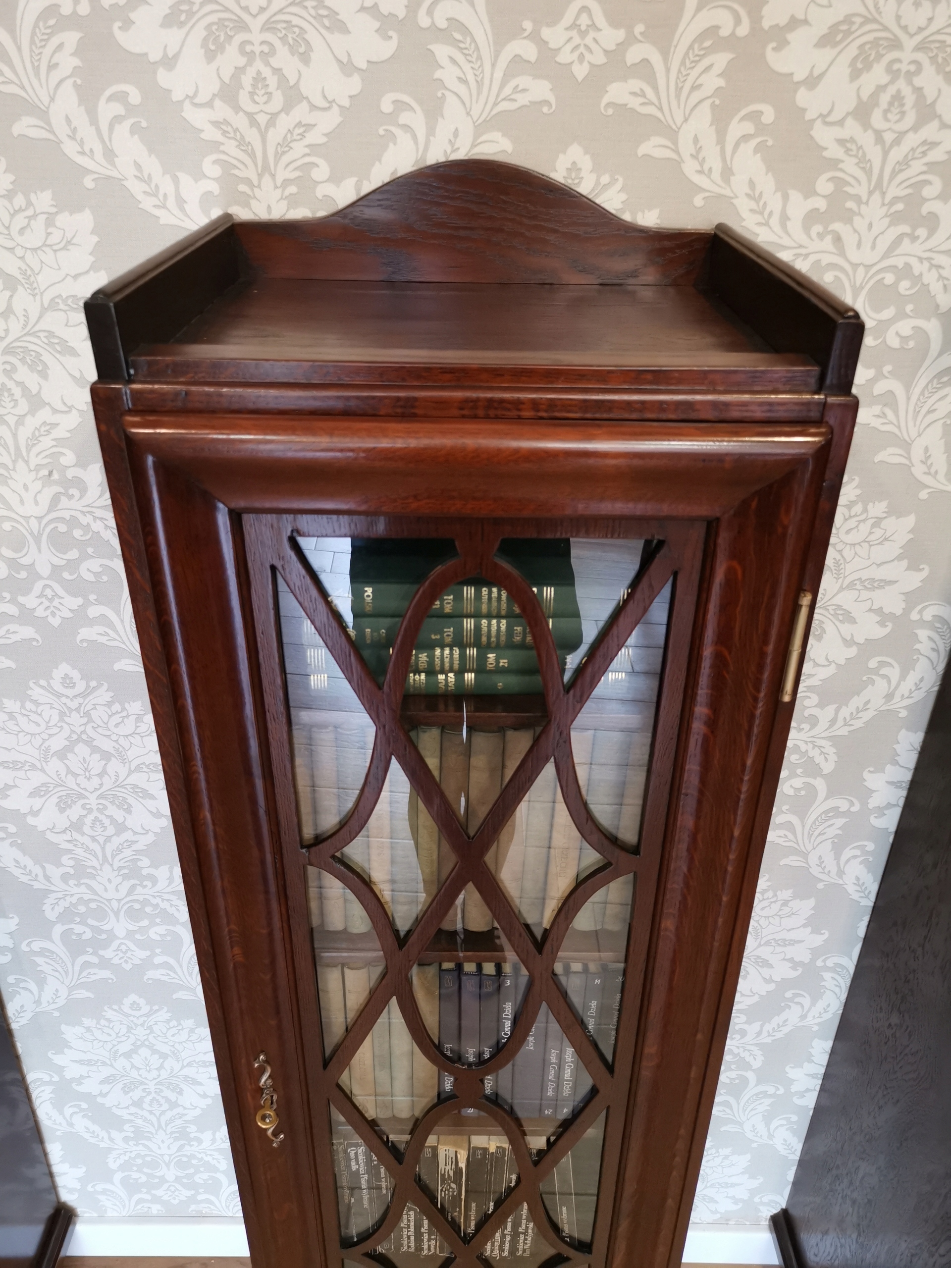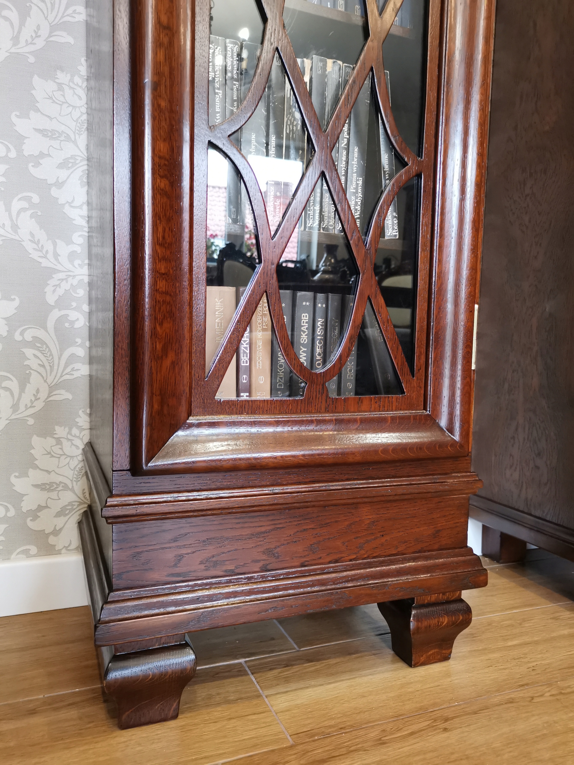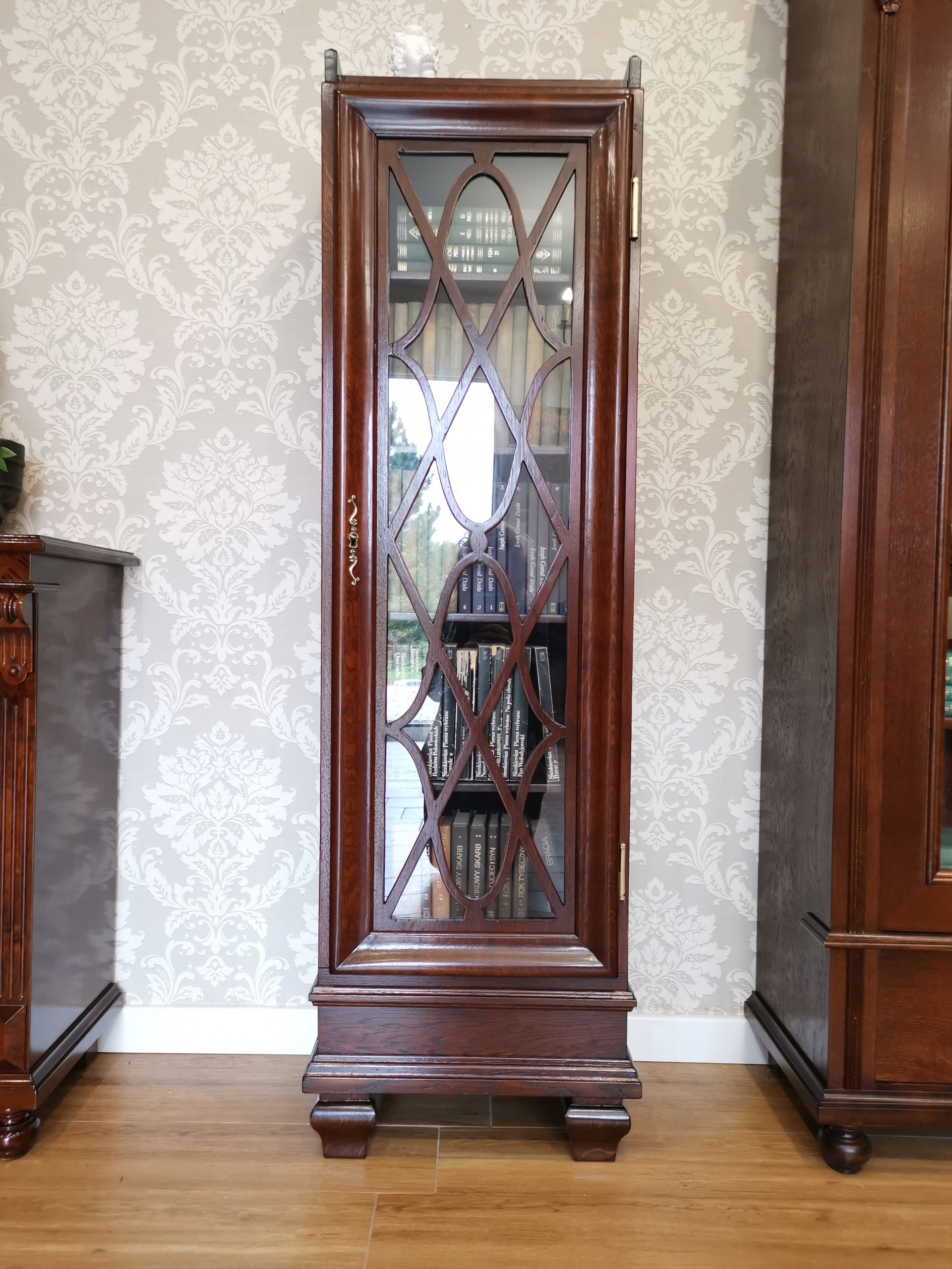 Ця елегантна шафа-вітрина вражає своєю формою та деталями - стрічка на склі надає їй унікальний характер, а дубовий шпон додає тепла та природного шарму.