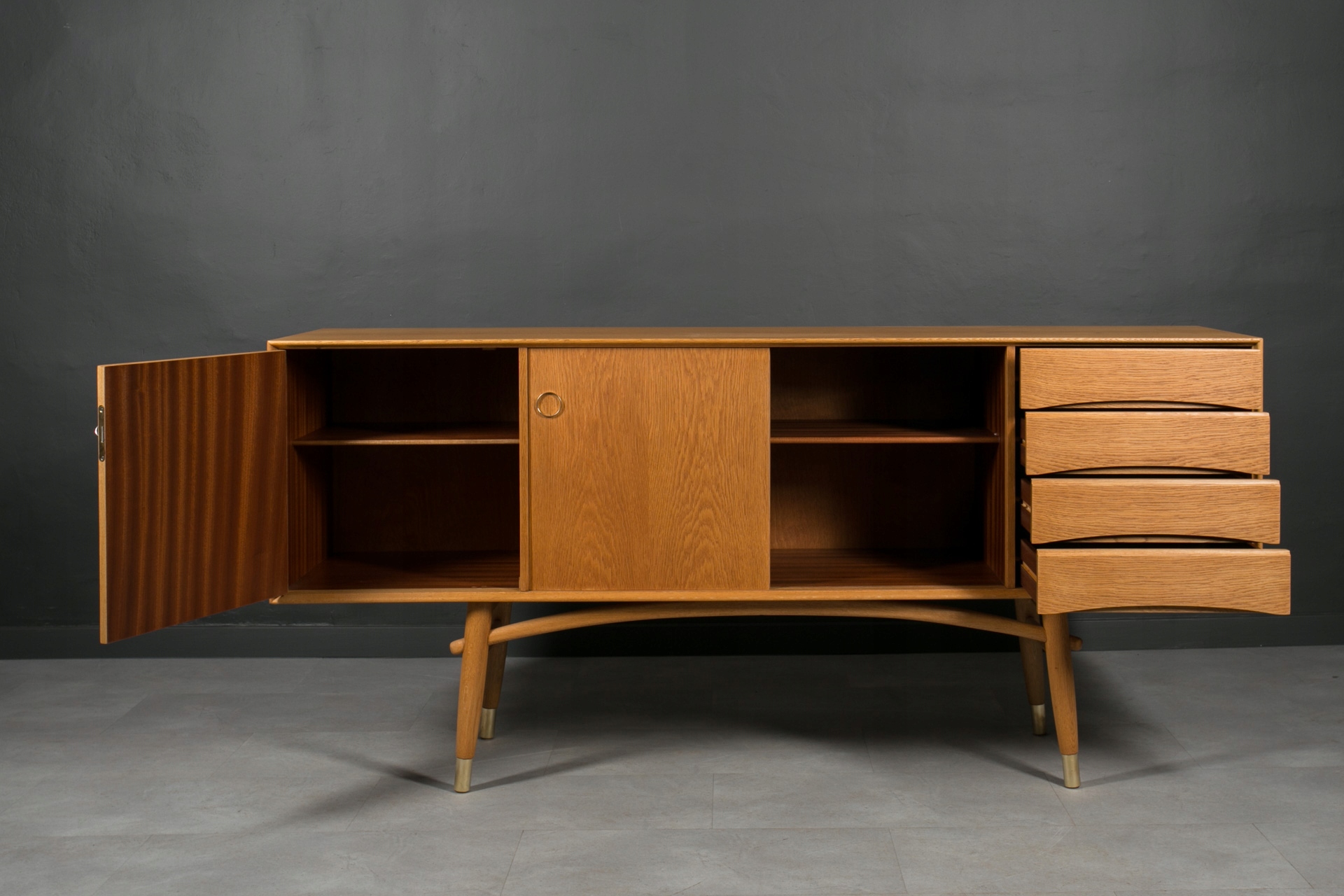Цей вишуканий сервант є справжнім шедевром, розробленим для меблевої фабрики Gustav Bahus приблизно в 1950 році. Цей надзвичайний виріб гармонійно поєднує в собі гарний скандинавський дизайн і функціональність, що робить його обов’язковим для вибагливих поціновувачів. Виготовлена з деревини дуба, яка не тільки забезпечує довговічність тумби, але й надає їй природного тепла та характеру, який покращується з віком. Ретельна увага до деталей помітна в плавно інтегрованих латунних деталях, що демонструють як естетику, так і функціональність. Окрім естетичної привабливості, ця тумба пропонує практичні рішення для зберігання з місткими відділеннями та ящиками, що забезпечує багато місця для організації та легкого доступу до найважливіших речей. Виготовлений Густавом Бахусом, відомим норвезьким виробником меблів, цей предмет є свідченням спадщини країни витонченої майстерності та найкращого норвезького дизайну. Меблі були ретельно відреставровані та оброблені високоякісним маслом, що надає їм натуральний вигляд. Уявіть собі цей приголомшливий виріб як центр вашої їдальні, житлової кімнати чи передпокою, миттєво покращуючи загальну естетику вашого дому. Незалежно від того, чи є ви колекціонером скарбів середини століття чи шанувальником класичного дизайну, ця тумба обов’язково стане цінним центральним елементом, який викличе розмову та захоплення.