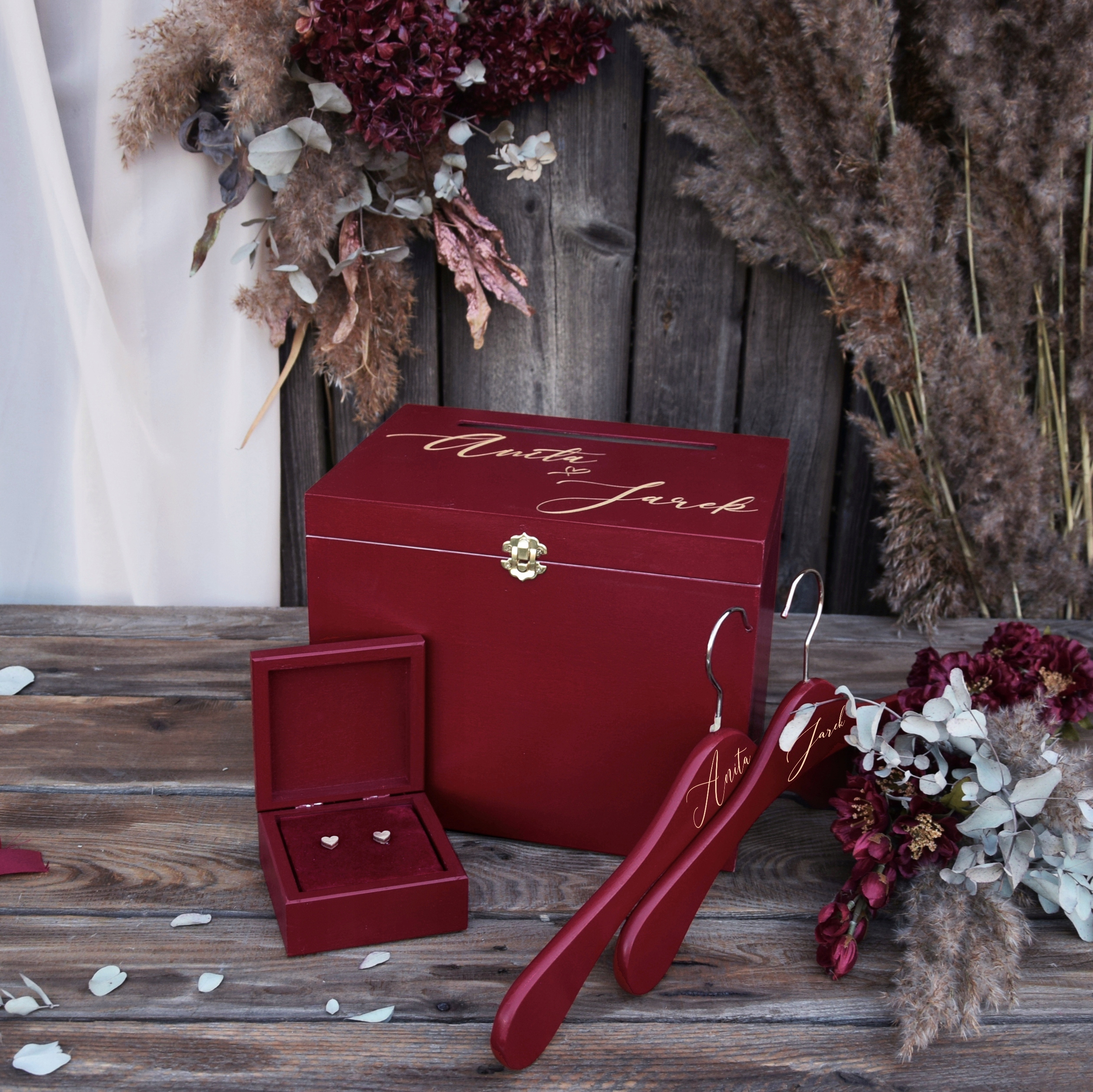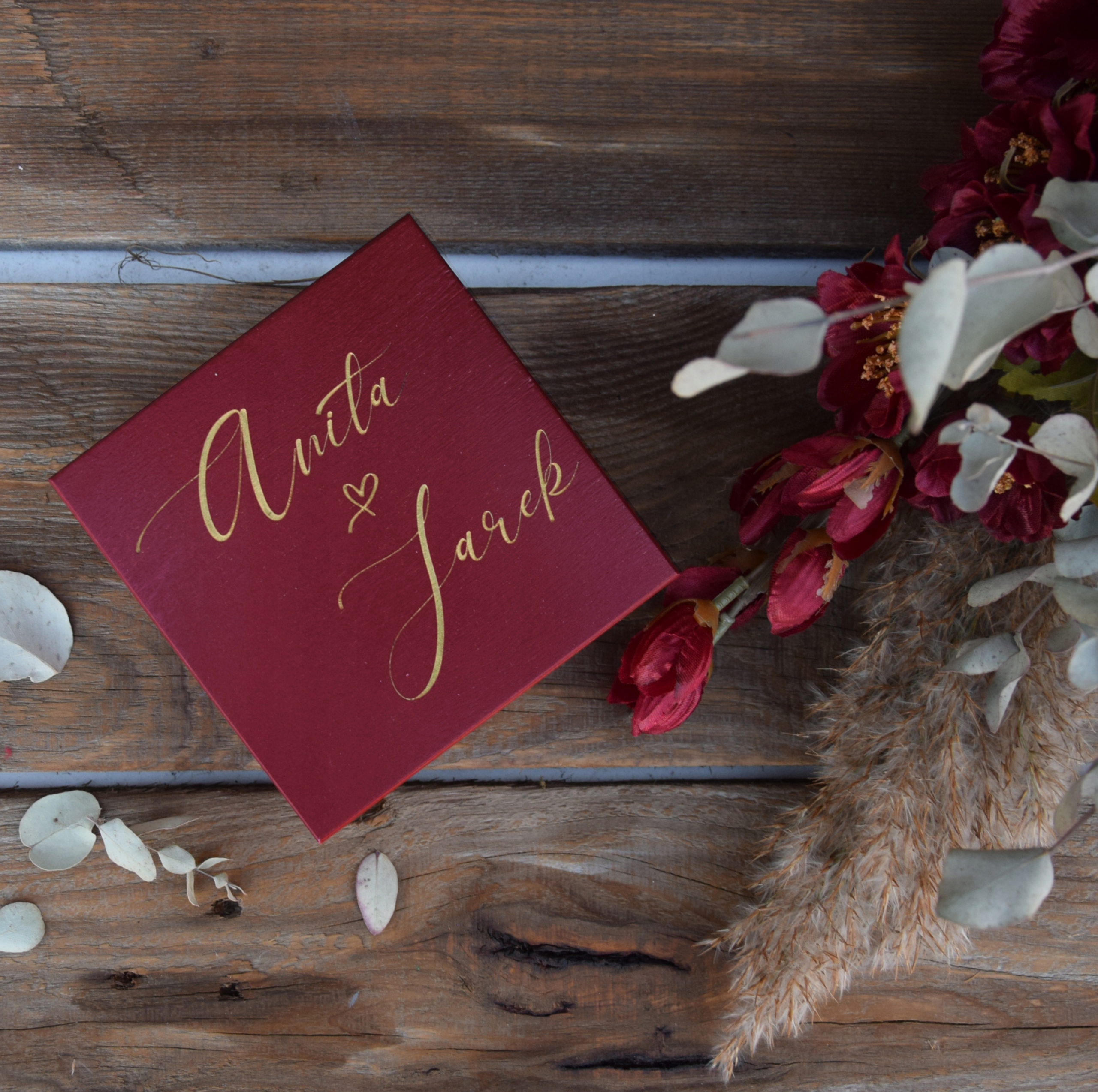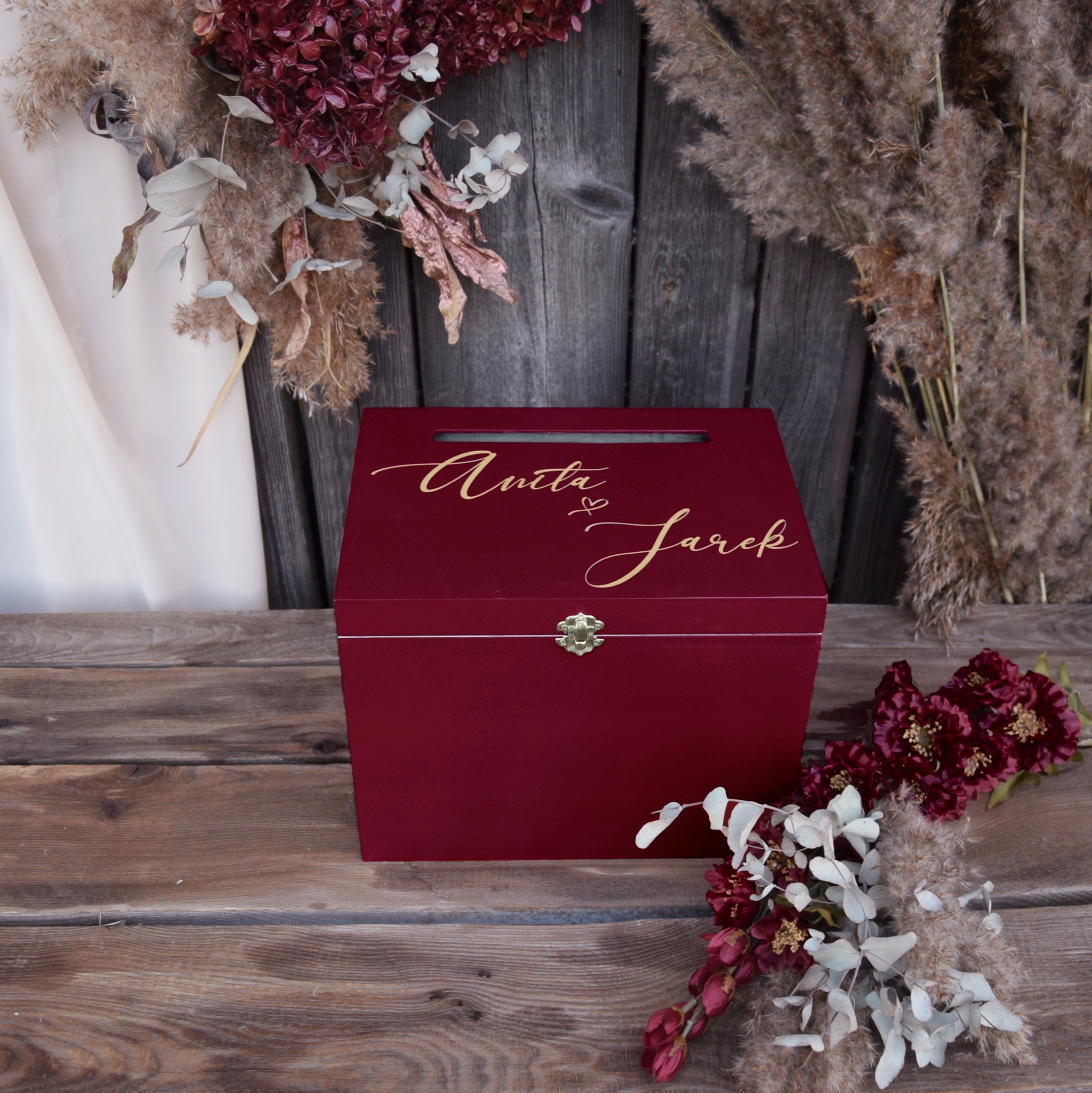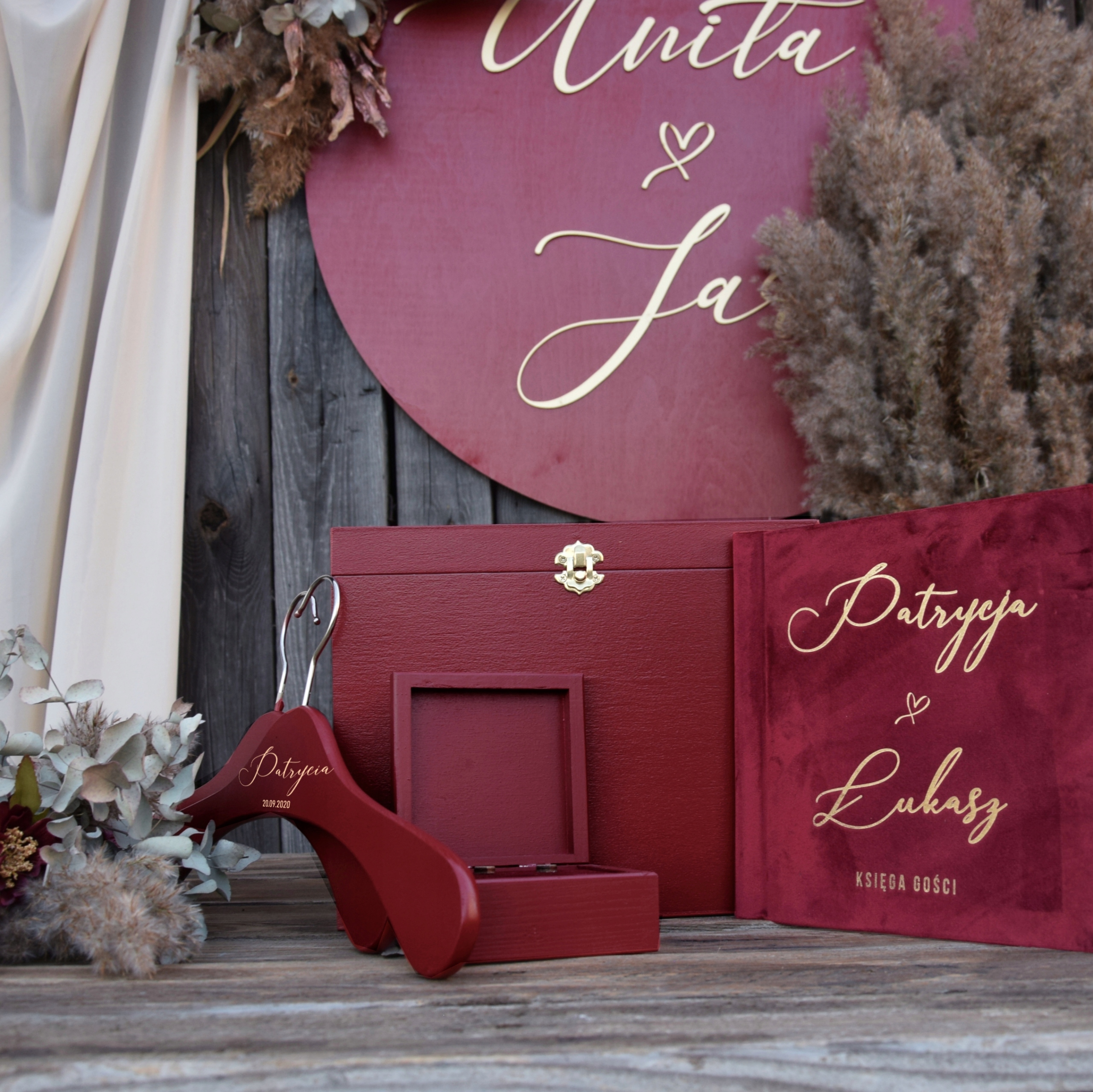Duże BORDOWE BURGUNT Pudełko na KOPERTY + OBRĄCZKI