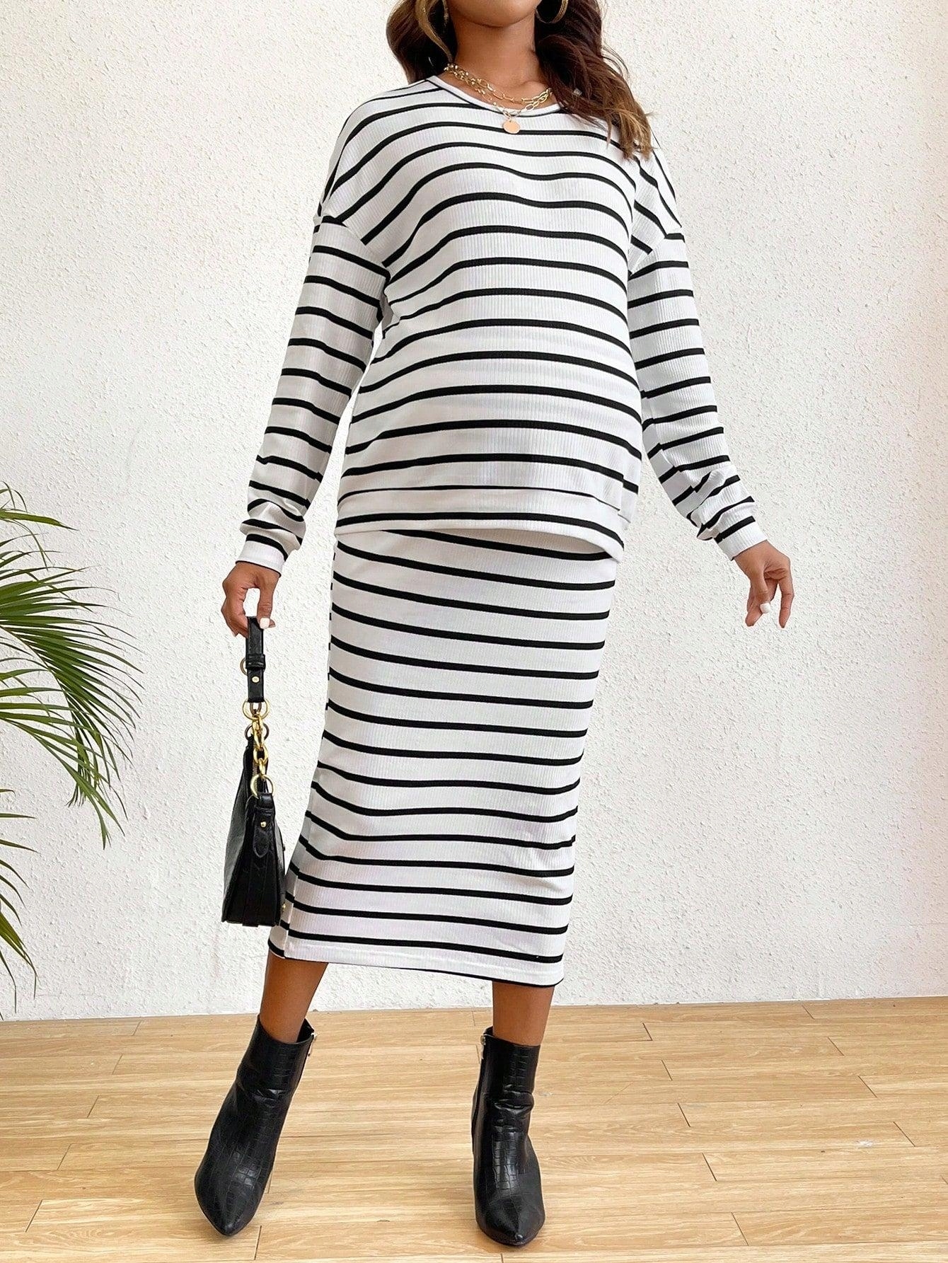 DŁUGI RĘKAW SPÓDNICA PASKI SHEIN 40/42 KOMPLET CIĄŻOWY CZARNO BIAŁY BLUZKA