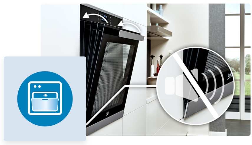 Завдяки новій конструкції петель дверцята цієї духової шафи Beko працюють плавно, м'яко і тихо - без тріску і зайвого шуму.