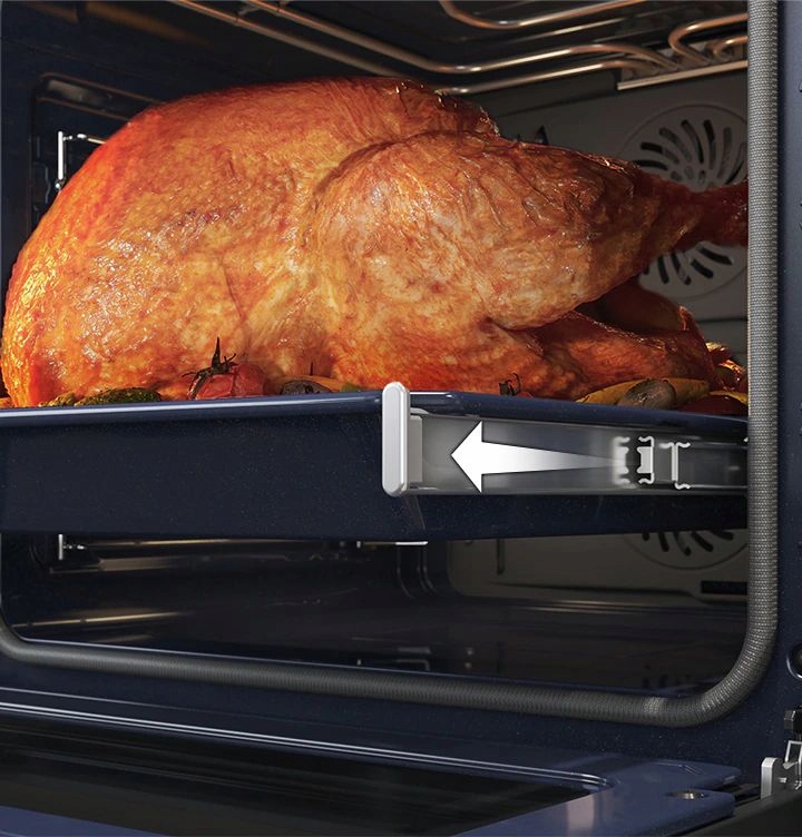 Легке вставляння та виймання посуду з духовки. Телескопічні напрямні плавно висуваються і залишаються стійкими, навіть якщо на них поставлено великий і важкий посуд. Завдяки цій функції ви також можете поливати, перевертати та приправляти їжу без ризику проливання.