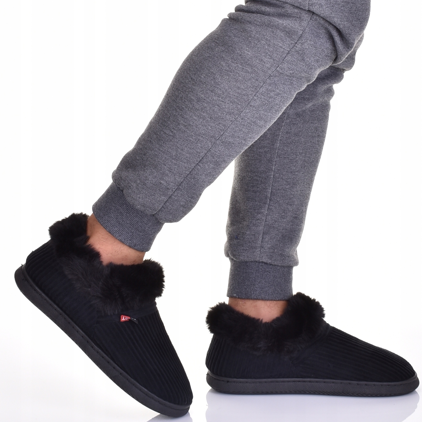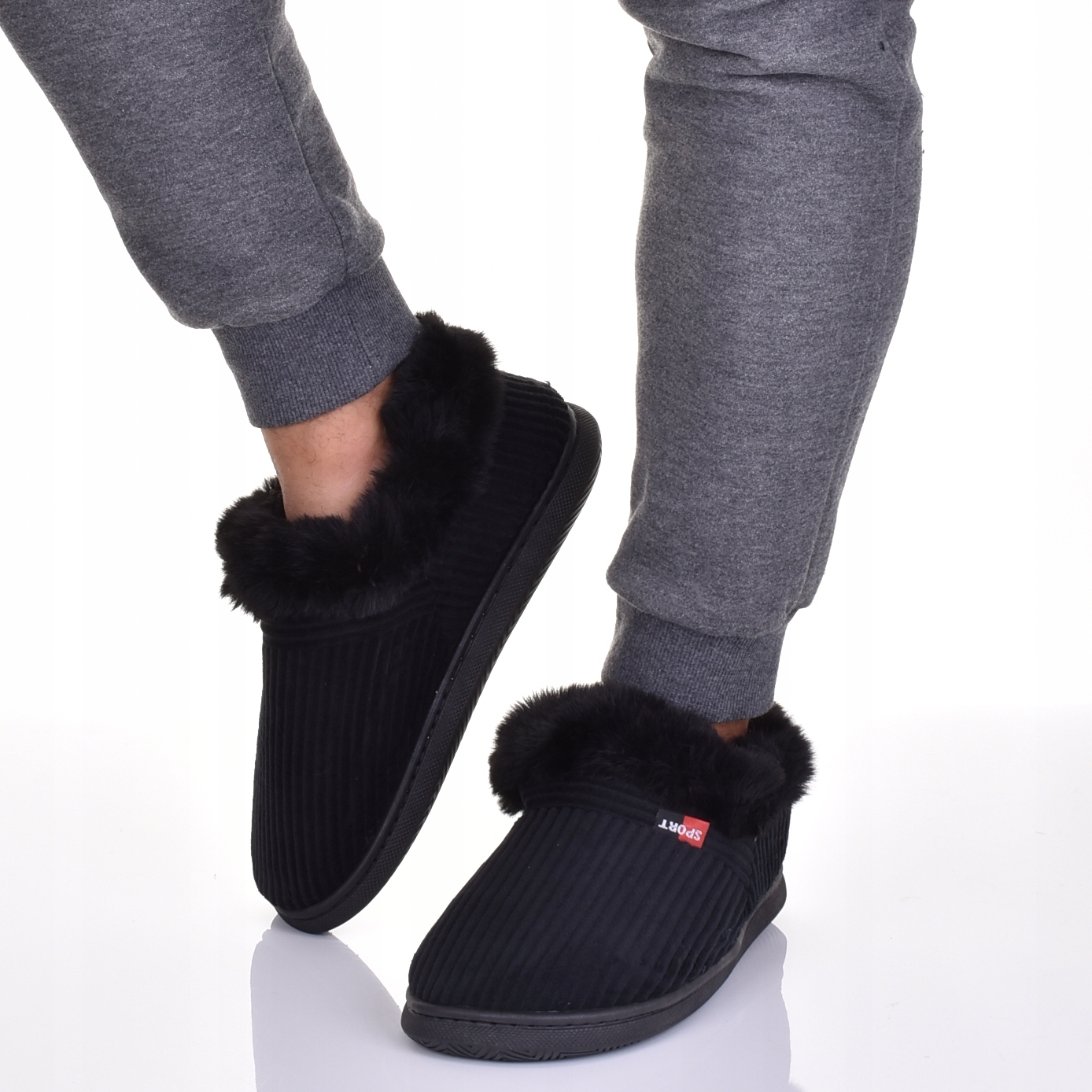 Повні тапочки, виготовлені з дуже м'якого та теплого матеріалу - вельвету з густим декоративним хутром навколо щиколотки.