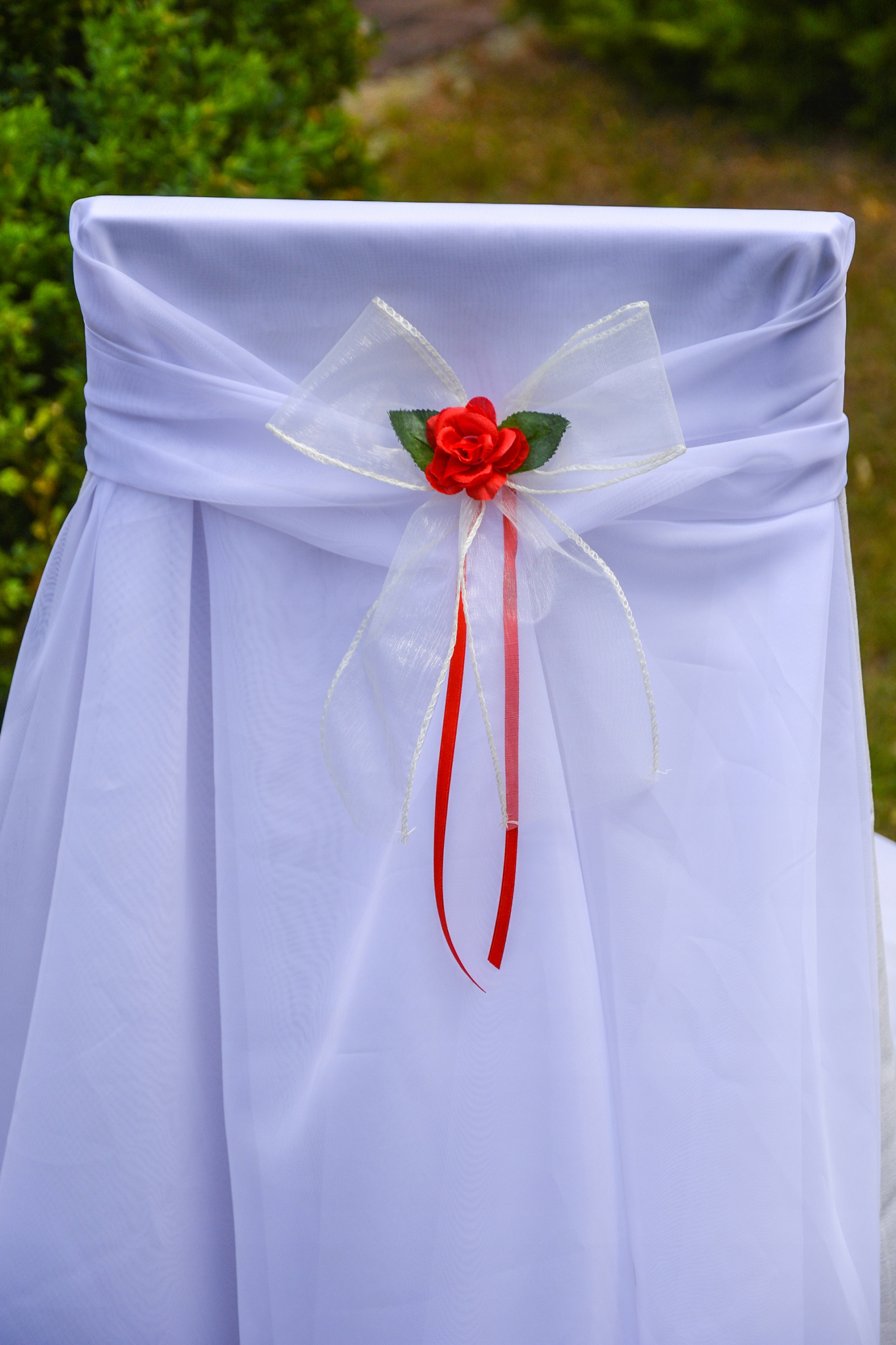Банти виготовлені з білої органзи, прикрашені трояндою кольору екрю з ніжним рожевим на кінчиках і зелене листя. Кріпляться на атласну стрічку кольору екрю.