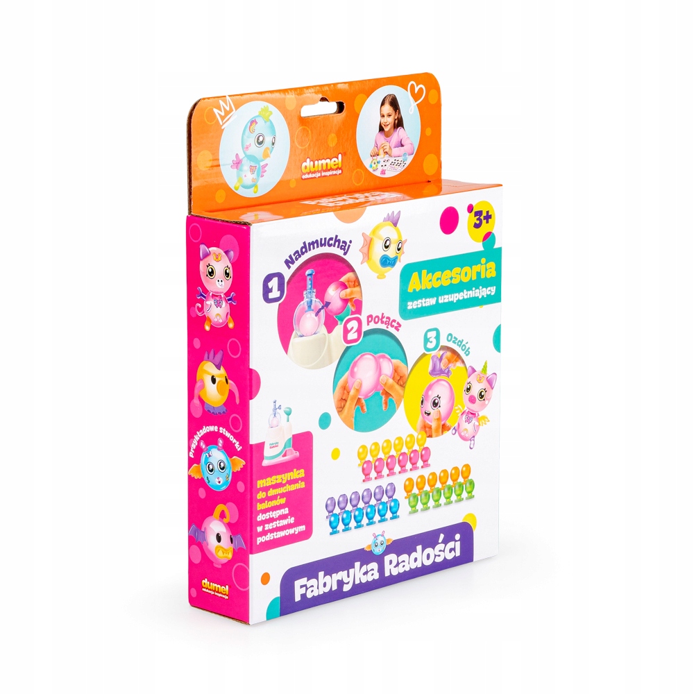 Набір аксесуарів є доповненням до базового набору Factory of Joy - Balloons. Ви знайдете цілих 162 елементи, включаючи різнокольорові повітряні кулі, наклейки та смішні очі, за допомогою яких ви можете створити ще більше персонажів із повітряних куль.