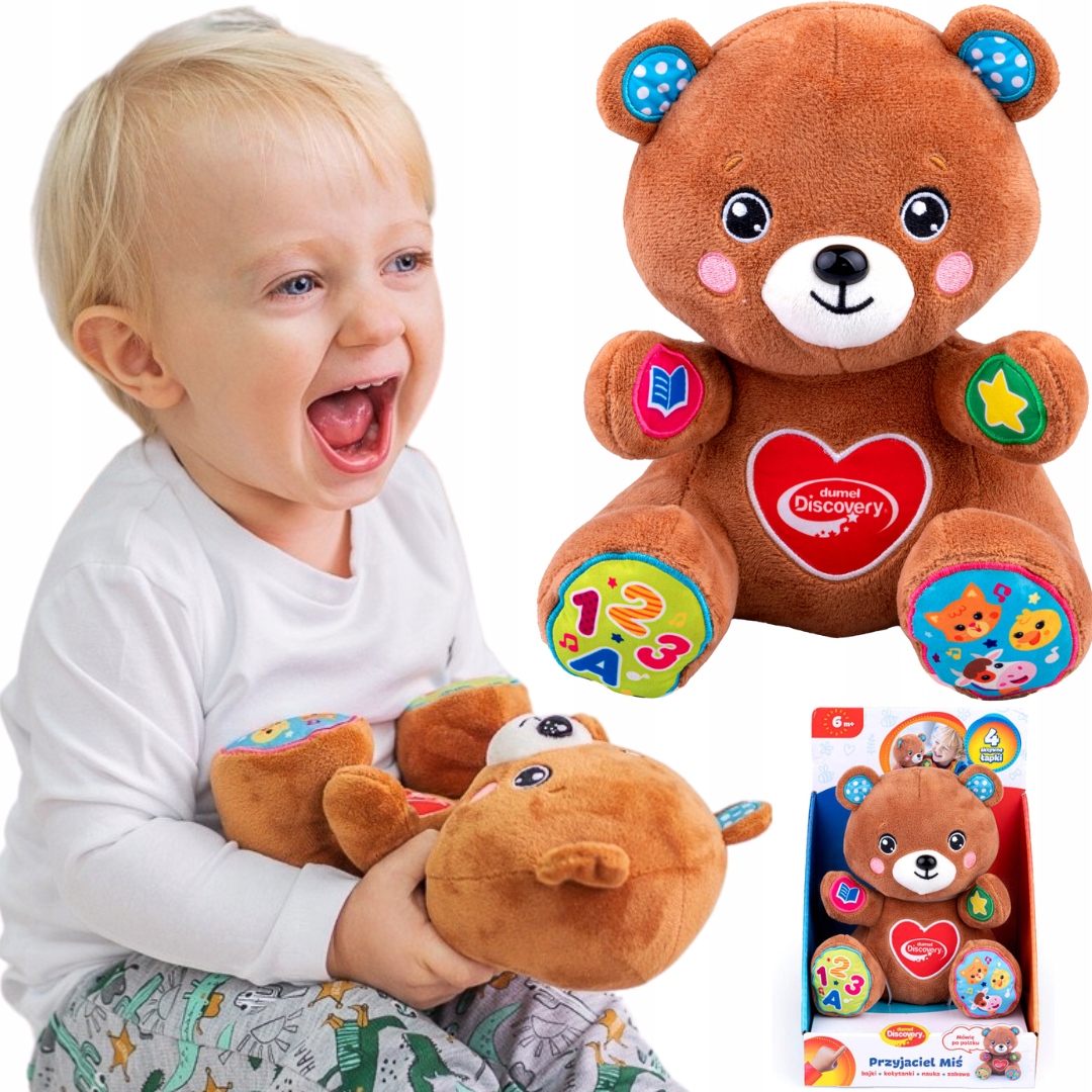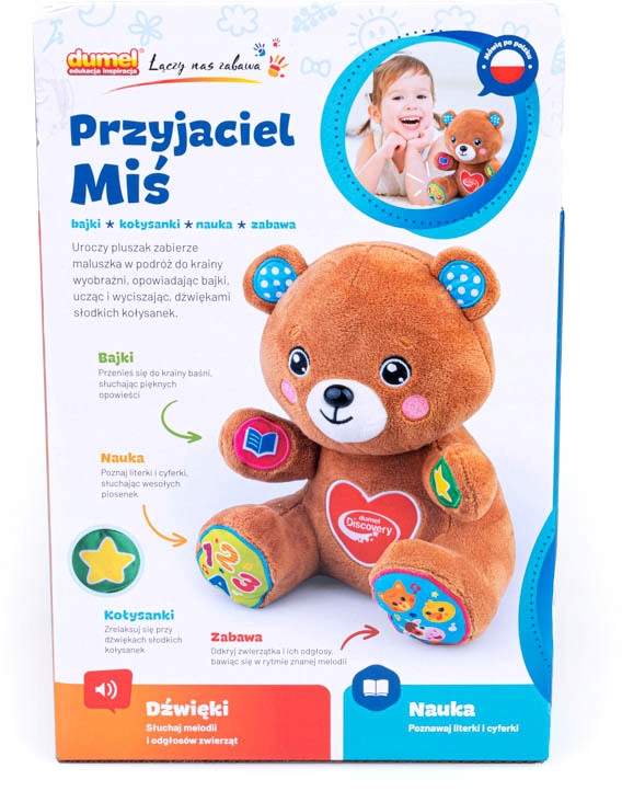 Чи знаєте ви, що є спосіб перенестись у безпечний світ уяви, не виходячи з дому? Міцно обійміть ведмедика і притисніть його лапки, щоб разом з ним відкривати чудові казкові країни, вивчати алфавіт, цифри та знайомитися з тваринами. У кожній лапі ведмедика – свій сюрприз! Окрім казок, ви знайдете також колискові, пісні польською мовою, вірші та веселі фрази. З малюком завжди може бути ведмедик. Вдень плюшевий друг подарує йому веселі розваги, а ввечері розповість казку або заграє на сон солодку колискову.