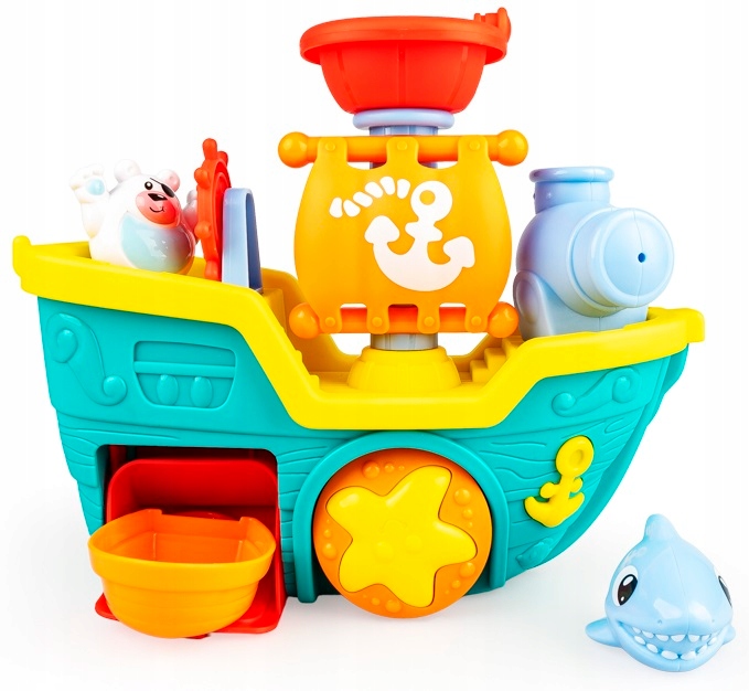- Завдяки рукоятка, гармата, що бринить, кручена зірка та фігури пірата й акули дитина відкриває для себе світ руху води, експериментує та будує власну піратську історію.