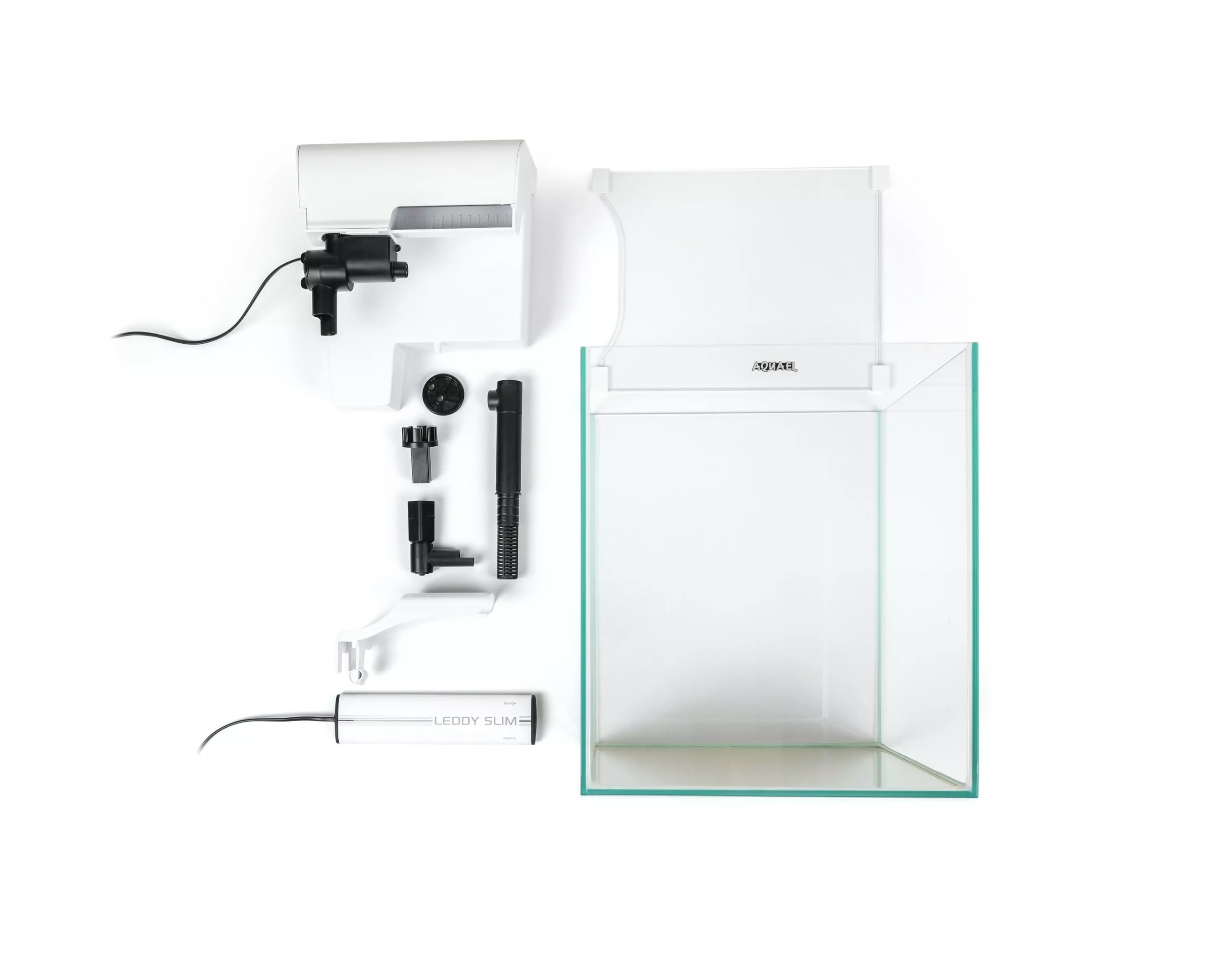 Повний набір акваріума для встановлення морського нан-човна. (35x35x40 см). Набір має елегантну скляну склянку з вирізаним для каскадного фільтра. Крім того, набір супроводжується захисним килимком для захисту дна.