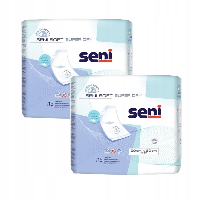 У набір входить 2 упаковки гігієнічних прокладок Seni Soft Super Dry 90x60см по 15 штук.