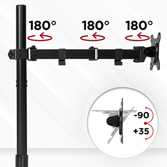 4 Перевірте реальні розміри своїх моніторів перед замовленням. Кожне з плечей може нести до 8 кг і забезпечити відмінну стабільність. Якщо ваше обладнання має інші розміри, перевірте наші аукціони, щоб вибрати найкраще рішення.Ця модель ручки дозволяє нахилити монітори на 15 °, горизонтальний оборот на 180 ° та 360 ° горизонтально і навколо її осі. Максимальне відкриття затискача - 6,8 см. Монітори встановлені безпосередньо до голови та руки. Усі аксесуари, необхідні для монтажу руки, включаються до набору.
