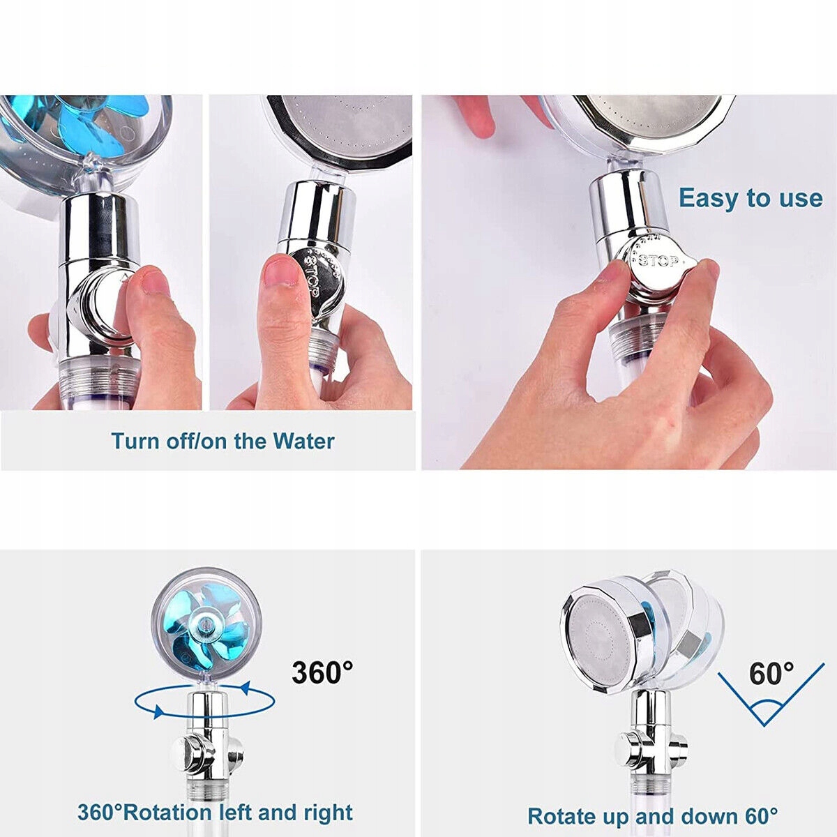 Використовує турбовентилятор для збільшення тиску води, використовуючи на 40% менше води, ніж традиційні душові лійки. Коли ви використовуєте цю пропелерну душову лійку, внутрішній турбовентилятор обертається, і вода створює красиву форму. Нехай ваша дитина насолоджується душем.