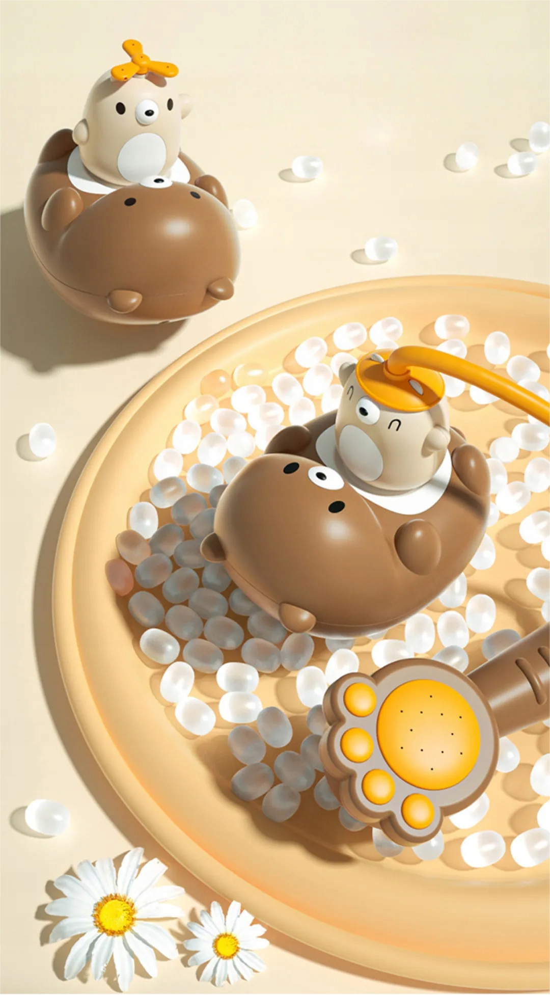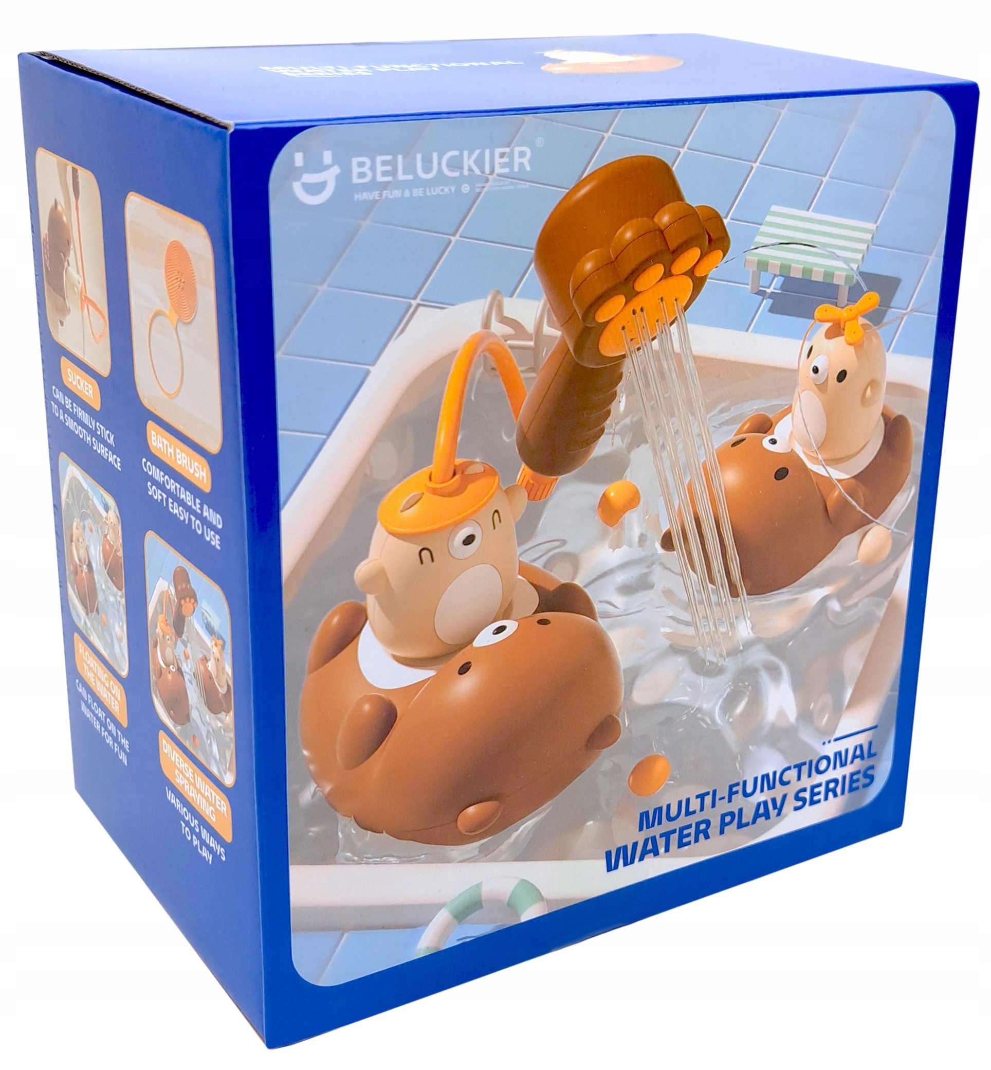 Це оригінальна ідея для іграшки для купання! Ніжне вираз обличчя ведмедика та його веселих товаришів, їх обтічні форми зацікавлять дітей і перетворять звичайну, нудну ванну на моменти, повні радості та веселощів. Чудовим резервуаром для нашої іграшки може стати не тільки ванна. Басейн або навіть миска з водою чудово підійдуть. Додатковою перевагою є масажна подушечка, яка урізноманітнює ванну. Основа ведмедика має додаткову функцію у вигляді кнопки, захованої в роті. Натисканням на ніс можна регулювати швидкість потоку води.